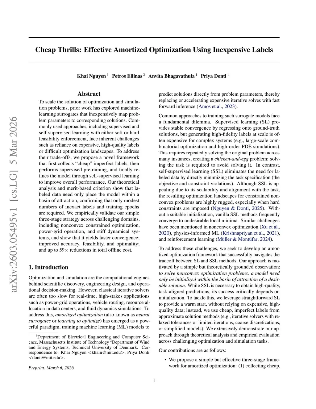 To scale the solution of optimization and simulation problems, prior work has explored machine-learning surrogates that inexpensively map problem parameters to corresponding solutions. Commonly used approaches, including supervised and self-supervised learning with either soft or hard feasibility enforcement, face inherent challenges such as reliance on expensive, high-quality labels or difficult optimization landscapes. To address their trade-offs, we propose a novel framework that first collects "cheap" imperfect labels, then performs supervised pretraining, and finally refines the model through self-supervised learning to improve overall performance. Our theoretical analysis and merit-based criterion show that labeled data need only place the model within a basin of attraction, confirming that only modest numbers of inexact labels and training epochs are required. We empirically validate our simple three-stage strategy across challenging domains, including nonconvex constrained optimization, power-grid operation, and stiff dynamical systems, and show that it yields faster convergence; improved accuracy, feasibility, and optimality; and up to 59x reductions in total offline cost.
