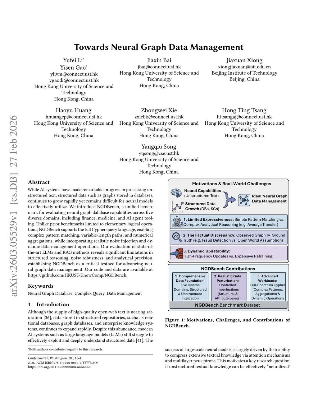While AI systems have made remarkable progress in processing unstructured text, structured data such as graphs stored in databases, continues to grow rapidly yet remains difficult for neural models to effectively utilize. We introduce NGDBench, a unified benchmark for evaluating neural graph database capabilities across five diverse domains, including finance, medicine, and AI agent tooling. Unlike prior benchmarks limited to elementary logical operations, NGDBench supports the full Cypher query language, enabling complex pattern matching, variable-length paths, and numerical aggregations, while incorporating realistic noise injection and dynamic data management operations. Our evaluation of state-of-the-art LLMs and RAG methods reveals significant limitations in structured reasoning, noise robustness, and analytical precision, establishing NGDBench as a critical testbed for advancing neural graph data management. Our code and data are available atthis https URL.