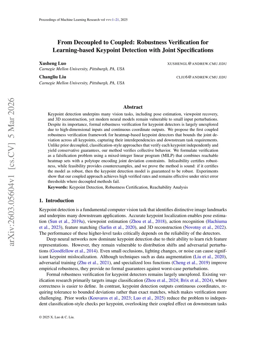 Keypoint detection underpins many vision tasks, including pose estimation, viewpoint recovery, and 3D reconstruction, yet modern neural models remain vulnerable to small input perturbations. Despite its importance, formal robustness verification for keypoint detectors is largely unexplored due to high-dimensional inputs and continuous coordinate outputs. We propose the first coupled robustness verification framework for heatmap-based keypoint detectors that bounds the joint deviation across all keypoints, capturing their interdependencies and downstream task requirements. Unlike prior decoupled, classification-style approaches that verify each keypoint independently and yield conservative guarantees, our method verifies collective behavior. We formulate verification as a falsification problem using a mixed-integer linear program (MILP) that combines reachable heatmap sets with a polytope encoding joint deviation constraints. Infeasibility certifies robustness, while feasibility provides counterexamples, and we prove the method is sound: if it certifies the model as robust, then the keypoint detection model is guaranteed to be robust. Experiments show that our coupled approach achieves high verified rates and remains effective under strict error thresholds where decoupled methods fail.