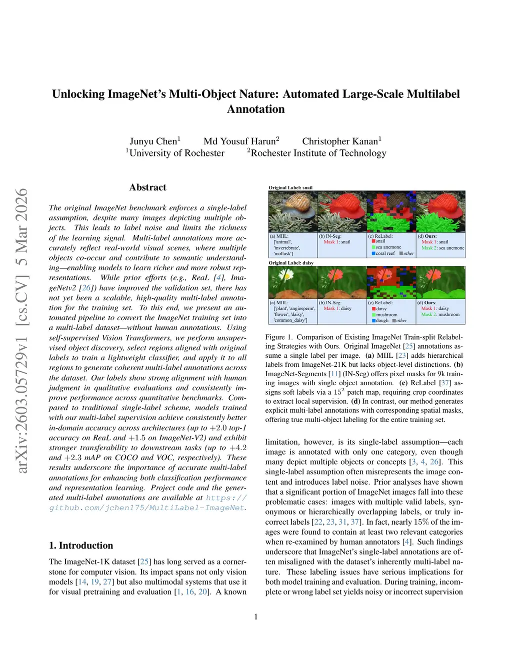 The original ImageNet benchmark enforces a single-label assumption, despite many images depicting multiple objects. This leads to label noise and limits the richness of the learning signal. Multi-label annotations more accurately reflect real-world visual scenes, where multiple objects co-occur and contribute to semantic understanding, enabling models to learn richer and more robust representations. While prior efforts (e.g., ReaL, ImageNetv2) have improved the validation set, there has not yet been a scalable, high-quality multi-label annotation for the training set. To this end, we present an automated pipeline to convert the ImageNet training set into a multi-label dataset, without human annotations. Using self-supervised Vision Transformers, we perform unsupervised object discovery, select regions aligned with original labels to train a lightweight classifier, and apply it to all regions to generate coherent multi-label annotations across the dataset. Our labels show strong alignment with human judgment in qualitative evaluations and consistently improve performance across quantitative benchmarks. Compared to traditional single-label scheme, models trained with our multi-label supervision achieve consistently better in-domain accuracy across architectures (up to +2.0 top-1 accuracy on ReaL and +1.5 on ImageNet-V2) and exhibit stronger transferability to downstream tasks (up to +4.2 and +2.3 mAP on COCO and VOC, respectively). These results underscore the importance of accurate multi-label annotations for enhancing both classification performance and representation learning. Project code and the generated multi-label annotations are available atthis https URL.