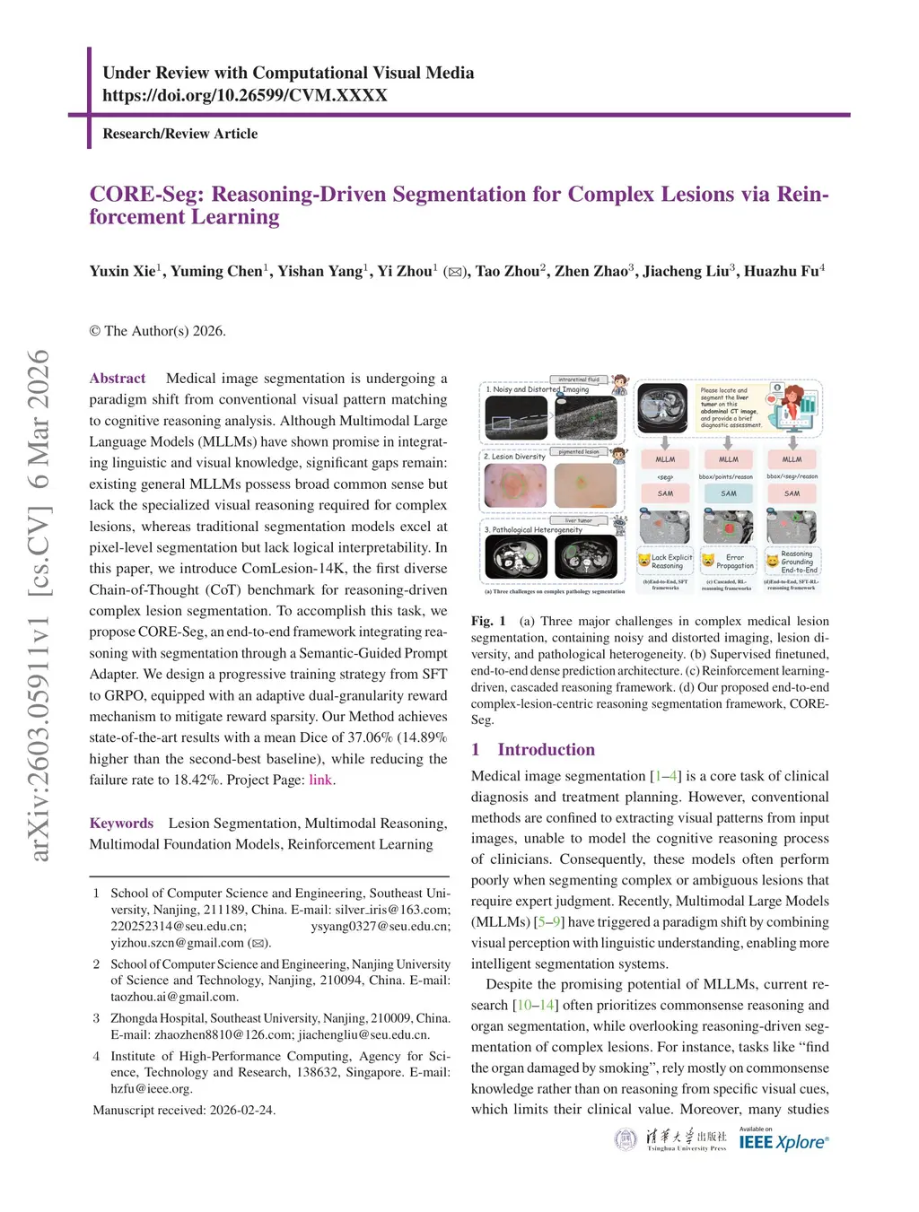 Medical image segmentation is undergoing a paradigm shift from conventional visual pattern matching to cognitive reasoning analysis. Although Multimodal Large Language Models (MLLMs) have shown promise in integrating linguistic and visual knowledge, significant gaps remain: existing general MLLMs possess broad common sense but lack the specialized visual reasoning required for complex lesions, whereas traditional segmentation models excel at pixel-level segmentation but lack logical interpretability. In this paper, we introduce ComLesion-14K, the first diverse Chain-of-Thought (CoT) benchmark for reasoning-driven complex lesion segmentation. To accomplish this task, we propose CORE-Seg, an end-to-end framework integrating reasoning with segmentation through a Semantic-Guided Prompt Adapter. We design a progressive training strategy from SFT to GRPO, equipped with an adaptive dual-granularity reward mechanism to mitigate reward sparsity. Our Method achieves state-of-the-art results with a mean Dice of 37.06\% (14.89\% higher than the second-best baseline), while reducing the failure rate to 18.42\%. Project Page:this https URL