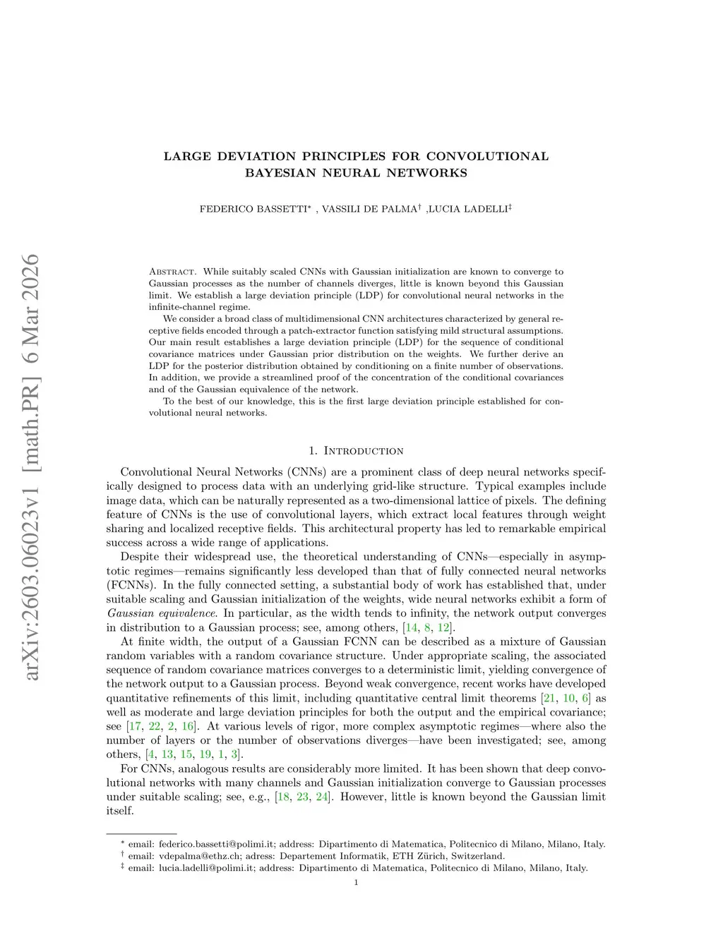 While suitably scaled CNNs with Gaussian initialization are known to converge to Gaussian processes as the number of channels diverges, little is known beyond this Gaussian limit. We establish a large deviation principle (LDP) for convolutional neural networks in the infinite-channel regime.We consider a broad class of multidimensional CNN architectures characterized by general receptive fields encoded through a patch-extractor function satisfying mild structural assumptions. Our main result establishes a large deviation principle (LDP) for the sequence of conditional covariance matrices under Gaussian prior distribution on the weights. We further derive an LDP for the posterior distribution obtained by conditioning on a finite number of observations. In addition, we provide a streamlined proof of the concentration of the conditional covariances and of the Gaussian equivalence of the network.To the best of our knowledge, this is the first large deviation principle established for convolutional neural networks.