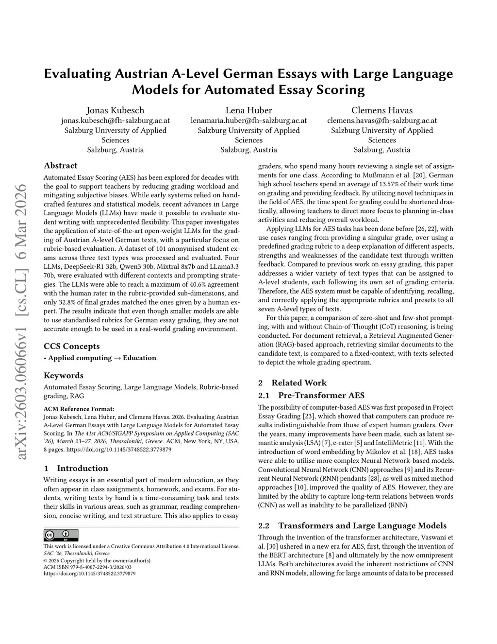 Automated Essay Scoring (AES) has been explored for decades with the goal to support teachers by reducing grading workload and mitigating subjective biases. While early systems relied on handcrafted features and statistical models, recent advances in Large Language Models (LLMs) have made it possible to evaluate student writing with unprecedented flexibility. This paper investigates the application of state-of-the-art open-weight LLMs for the grading of Austrian A-level German texts, with a particular focus on rubric-based evaluation. A dataset of 101 anonymised student exams across three text types was processed and evaluated. Four LLMs, DeepSeek-R1 32b, Qwen3 30b, Mixtral 8x7b and LLama3.3 70b, were evaluated with different contexts and prompting strategies. The LLMs were able to reach a maximum of 40.6% agreement with the human rater in the rubric-provided sub-dimensions, and only 32.8% of final grades matched the ones given by a human expert. The results indicate that even though smaller models are able to use standardised rubrics for German essay grading, they are not accurate enough to be used in a real-world grading environment.