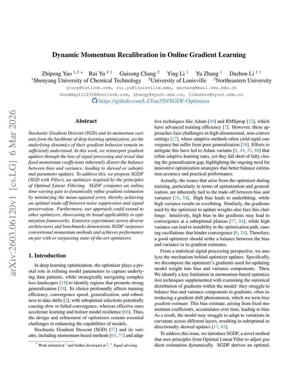 Stochastic Gradient Descent (SGD) and its momentum variants form the backbone of deep learning optimization, yet the underlying dynamics of their gradient behavior remain insufficiently understood. In this work, we reinterpret gradient updates through the lens of signal processing and reveal that fixed momentum coefficients inherently distort the balance between bias and variance, leading to skewed or suboptimal parameter updates. To address this, we propose SGDF (SGD with Filter), an optimizer inspired by the principles of Optimal Linear Filtering. SGDF computes an online, time-varying gain to dynamically refine gradient estimation by minimizing the mean-squared error, thereby achieving an optimal trade-off between noise suppression and signal preservation. Furthermore, our approach could extend to other optimizers, showcasing its broad applicability to optimization frameworks. Extensive experiments across diverse architectures and benchmarks demonstrate SGDF surpasses conventional momentum methods and achieves performance on par with or surpassing state-of-the-art optimizers.