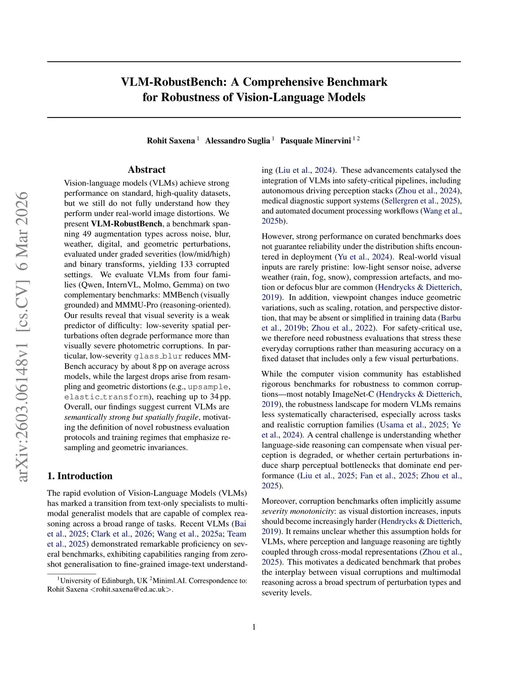 Vision-language models (VLMs) achieve strong performance on standard, high-quality datasets, but we still do not fully understand how they perform under real-world image distortions. We present VLM-RobustBench, a benchmark spanning 49 augmentation types across noise, blur, weather, digital, and geometric perturbations, evaluated under graded severities (low/mid/high) and binary transforms, yielding 133 corrupted settings. We evaluate VLMs from four families (Qwen, InternVL, Molmo, Gemma) on two complementary benchmarks: MMBench (visually grounded) and MMMU-Pro (reasoning-oriented). Our results reveal that visual severity is a weak predictor of difficulty: low-severity spatial perturbations often degrade performance more than visually severe photometric corruptions. In particular, low-severity glass_blur reduces MMBench accuracy by about 8 pp on average across models, while the largest drops arise from resampling and geometric distortions (e.g., upsample, elastic_transform), reaching up to 34 pp. Overall, our findings suggest current VLMs are semantically strong but spatially fragile, motivating the definition of novel robustness evaluation protocols and training regimes that emphasize resampling and geometric invariances.