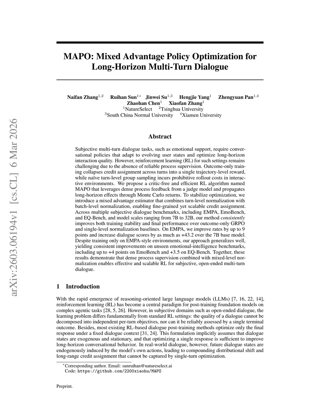 Subjective multi-turn dialogue tasks, such as emotional support, require conversational policies that adapt to evolving user states and optimize long-horizon interaction quality. However, reinforcement learning (RL) for such settings remains challenging due to the absence of reliable process supervision. Outcome-only training collapses credit assignment across turns into a single trajectory-level reward, while naïve turn-level group sampling incurs prohibitive rollout costs in interactive environments. We propose a critic-free and efficient RL algorithm named MAPO that leverages dense process feedback from a judge model and propagates long-horizon effects through Monte Carlo returns. To stabilize optimization, we introduce a mixed advantage estimator that combines turn-level normalization with batch-level normalization, enabling fine-grained yet scalable credit assignment. Across multiple subjective dialogue benchmarks, including EMPA, EmoBench, and EQ-Bench, and model scales ranging from 7B to 32B, our method consistently improves both training stability and final performance over outcome-only GRPO and single-level normalization baselines. On EMPA, we improve rates by up to 9 points and increase dialogue scores by as much as +43.2 over the 7B base model. Despite training only on EMPA-style environments, our approach generalizes well, yielding consistent improvements on unseen emotional-intelligence benchmarks, including up to +4 points on EmoBench and +3.5 on EQ-Bench. Together, these results demonstrate that dense process supervision combined with mixed-level normalization enables effective and scalable RL for subjective, open-ended multi-turn dialogue.