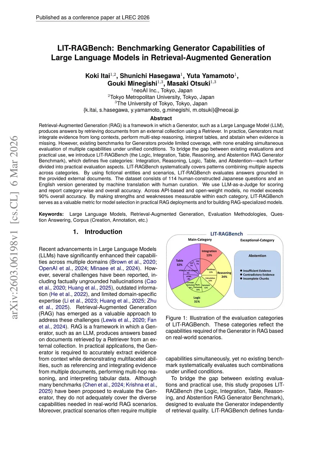 LIT-RAGBench: Benchmarking Generator Capabilities of Large Language Models in Retrieval-Augmented Generation