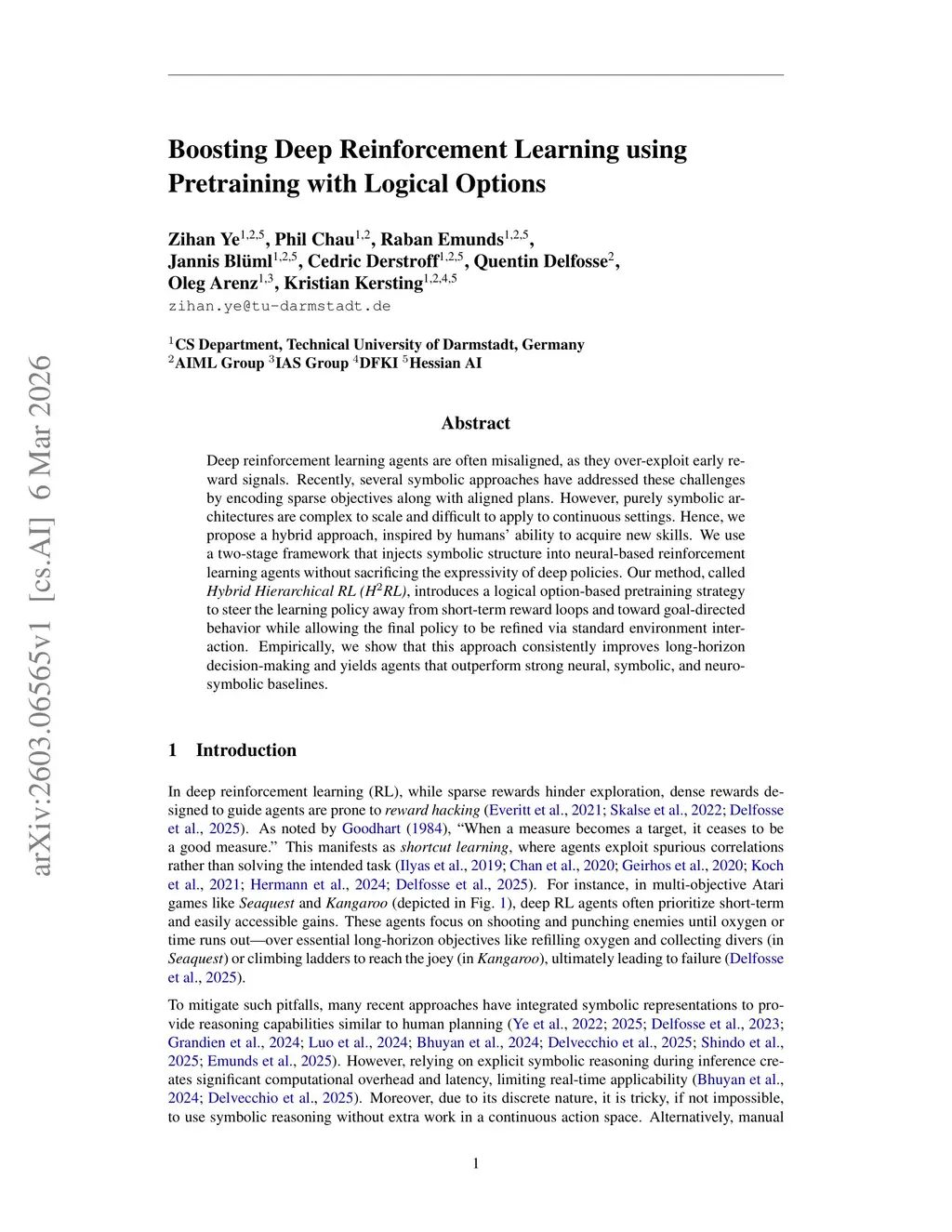 Deep reinforcement learning agents are often misaligned, as they over-exploit early reward signals. Recently, several symbolic approaches have addressed these challenges by encoding sparse objectives along with aligned plans. However, purely symbolic architectures are complex to scale and difficult to apply to continuous settings. Hence, we propose a hybrid approach, inspired by humans' ability to acquire new skills. We use a two-stage framework that injects symbolic structure into neural-based reinforcement learning agents without sacrificing the expressivity of deep policies. Our method, called Hybrid Hierarchical RL (H^2RL), introduces a logical option-based pretraining strategy to steer the learning policy away from short-term reward loops and toward goal-directed behavior while allowing the final policy to be refined via standard environment interaction. Empirically, we show that this approach consistently improves long-horizon decision-making and yields agents that outperform strong neural, symbolic, and neuro-symbolic baselines.