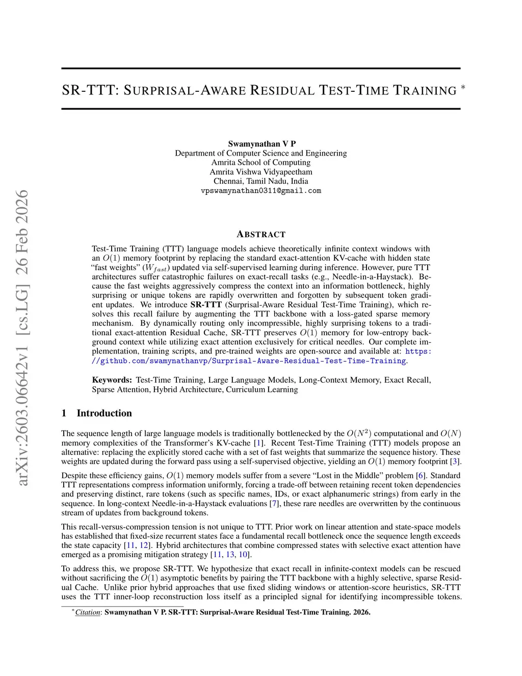 Test-Time Training (TTT) language models achieve theoretically infinite context windows with an O(1) memory footprint by replacing the standard exact-attention KV-cache with hidden state ``fast weights'' W_fast updated via self-supervised learning during inference. However, pure TTT architectures suffer catastrophic failures on exact-recall tasks (e.g., Needle-in-a-Haystack). Because the fast weights aggressively compress the context into an information bottleneck, highly surprising or unique tokens are rapidly overwritten and forgotten by subsequent token gradient updates. We introduce SR-TTT (Surprisal-Aware Residual Test-Time Training), which resolves this recall failure by augmenting the TTT backbone with a loss-gated sparse memory mechanism. By dynamically routing only incompressible, highly surprising tokens to a traditional exact-attention Residual Cache, SR-TTT preserves O(1) memory for low-entropy background context while utilizing exact attention exclusively for critical needles. Our complete implementation, training scripts, and pre-trained weights are open-source and available at:this https URL.