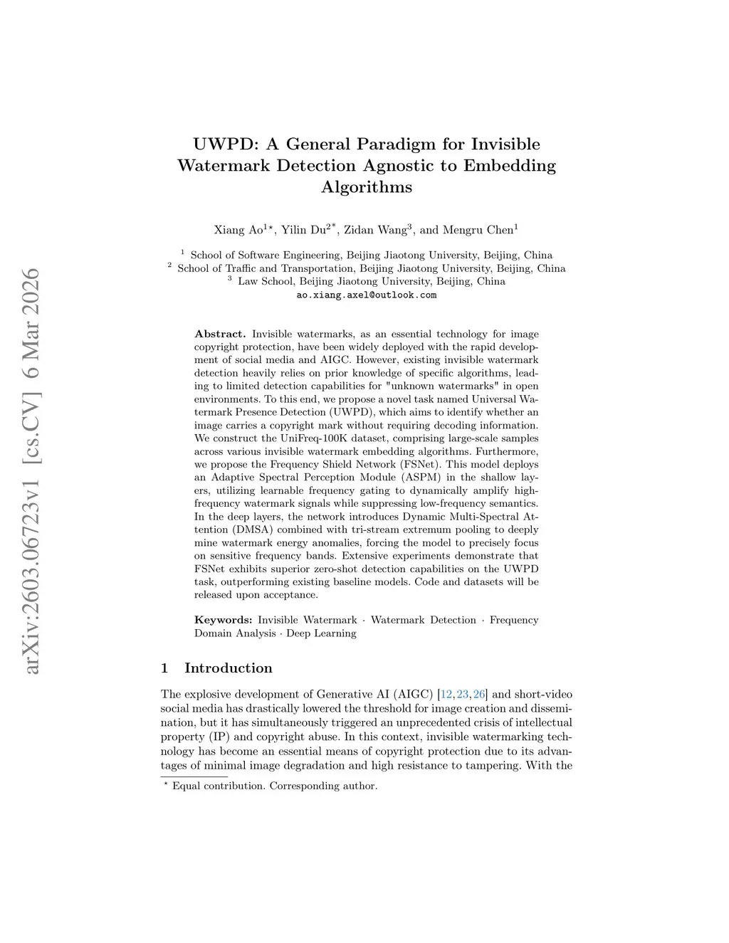 Invisible watermarks, as an essential technology for image copyright protection, have been widely deployed with the rapid development of social media and AIGC. However, existing invisible watermark detection heavily relies on prior knowledge of specific algorithms, leading to limited detection capabilities for ``unknown watermarks'' in open environments. To this end, we propose a novel task named Agnostic Watermark Presence Detection (AWPD), which aims to identify whether an image carries a copyright mark without requiring decoding information. We construct the UniFreq-100K dataset, comprising large-scale samples across various invisible watermark embedding algorithms. Furthermore, we propose the Frequency Shield Network (FSNet). This model deploys an Adaptive Spectral Perception Module (ASPM) in the shallow layers, utilizing learnable frequency gating to dynamically amplify high-frequency watermark signals while suppressing low-frequency semantics. In the deep layers, the network introduces Dynamic Multi-Spectral Attention (DMSA) combined with tri-stream extremum pooling to deeply mine watermark energy anomalies, forcing the model to precisely focus on sensitive frequency bands. Extensive experiments demonstrate that FSNet exhibits superior zero-shot detection capabilities on the AWPD task, outperforming existing baseline models. Code and datasets will be released upon acceptance.