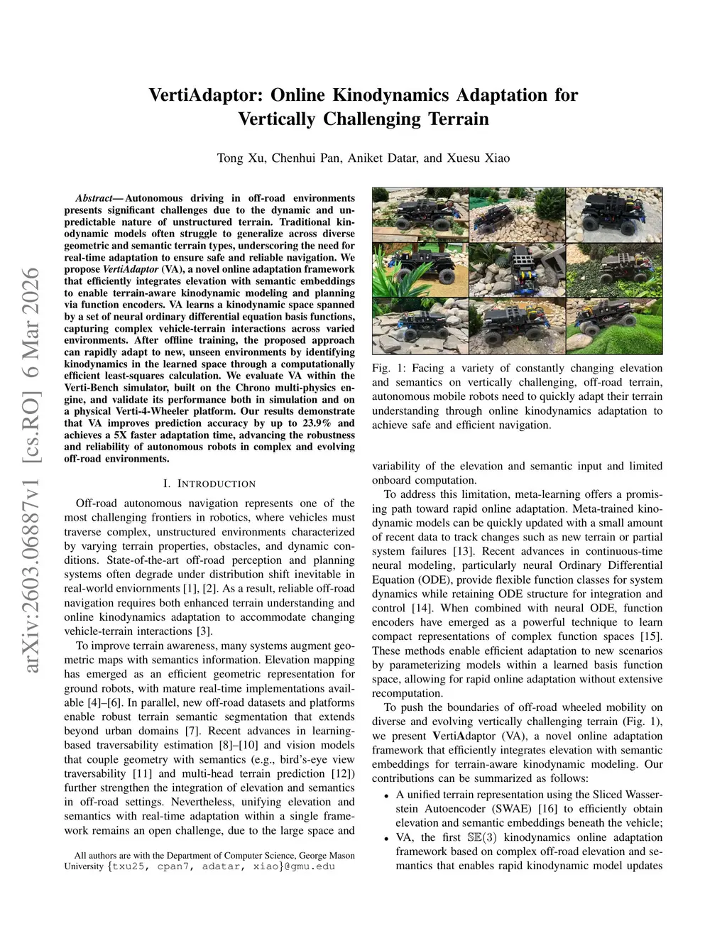 Autonomous driving in off-road environments presents significant challenges due to the dynamic and unpredictable nature of unstructured terrain. Traditional kinodynamic models often struggle to generalize across diverse geometric and semantic terrain types, underscoring the need for real-time adaptation to ensure safe and reliable navigation. We propose VertiAdaptor (VA), a novel online adaptation framework that efficiently integrates elevation with semantic embeddings to enable terrain-aware kinodynamic modeling and planning via function encoders. VA learns a kinodynamic space spanned by a set of neural ordinary differential equation basis functions, capturing complex vehicle-terrain interactions across varied environments. After offline training, the proposed approach can rapidly adapt to new, unseen environments by identifying kinodynamics in the learned space through a computationally efficient least-squares calculation. We evaluate VA within the Verti-Bench simulator, built on the Chrono multi-physics engine, and validate its performance both in simulation and on a physical Verti-4-Wheeler platform. Our results demonstrate that VA improves prediction accuracy by up to 23.9% and achieves a 5X faster adaptation time, advancing the robustness and reliability of autonomous robots in complex and evolving off-road environments.