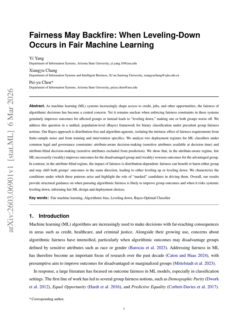 As machine learning (ML) systems increasingly shape access to credit, jobs, and other opportunities, the fairness of algorithmic decisions has become a central concern. Yet it remains unclear when enforcing fairness constraints in these systems genuinely improves outcomes for affected groups or instead leads to "leveling down," making one or both groups worse off. We address this question in a unified, population-level (Bayes) framework for binary classification under prevalent group fairness notions. Our Bayes approach is distribution-free and algorithm-agnostic, isolating the intrinsic effect of fairness requirements from finite-sample noise and from training and intervention specifics. We analyze two deployment regimes for ML classifiers under common legal and governance constraints: attribute-aware decision-making (sensitive attributes available at decision time) and attribute-blind decision-making (sensitive attributes excluded from prediction). We show that, in the attribute-aware regime, fair ML necessarily (weakly) improves outcomes for the disadvantaged group and (weakly) worsens outcomes for the advantaged group. In contrast, in the attribute-blind regime, the impact of fairness is distribution-dependent: fairness can benefit or harm either group and may shift both groups' outcomes in the same direction, leading to either leveling up or leveling down. We characterize the conditions under which these patterns arise and highlight the role of "masked" candidates in driving them. Overall, our results provide structural guidance on when pursuing algorithmic fairness is likely to improve group outcomes and when it risks systemic leveling down, informing fair ML design and deployment choices.