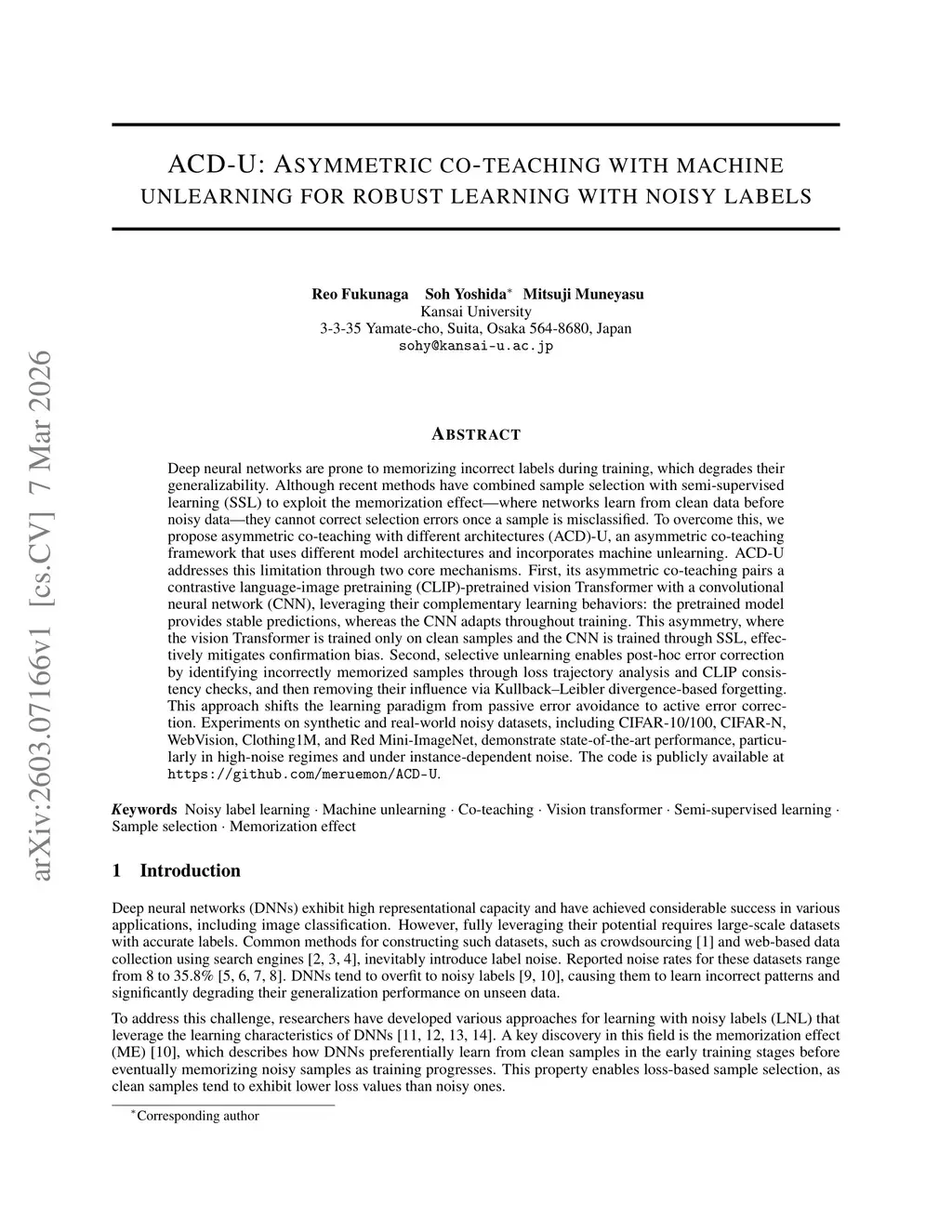 ACD-U: Asymmetric co-teaching with machine unlearning for robust learning with noisy labels