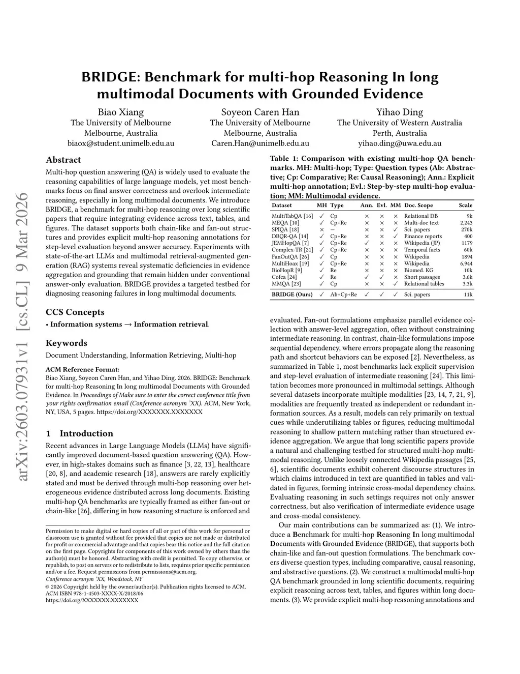 Multi-hop question answering (QA) is widely used to evaluate the reasoning capabilities of large language models, yet most benchmarks focus on final answer correctness and overlook intermediate reasoning, especially in long multimodal documents. We introduce BRIDGE, a benchmark for multi-hop reasoning over long scientific papers that require integrating evidence across text, tables, and figures. The dataset supports both chain-like and fan-out structures and provides explicit multi-hop reasoning annotations for step-level evaluation beyond answer accuracy. Experiments with state-of-the-art LLMs and multimodal retrieval-augmented generation (RAG) systems reveal systematic deficiencies in evidence aggregation and grounding that remain hidden under conventional answer-only evaluation. BRIDGE provides a targeted testbed for diagnosing reasoning failures in long multimodal documents.