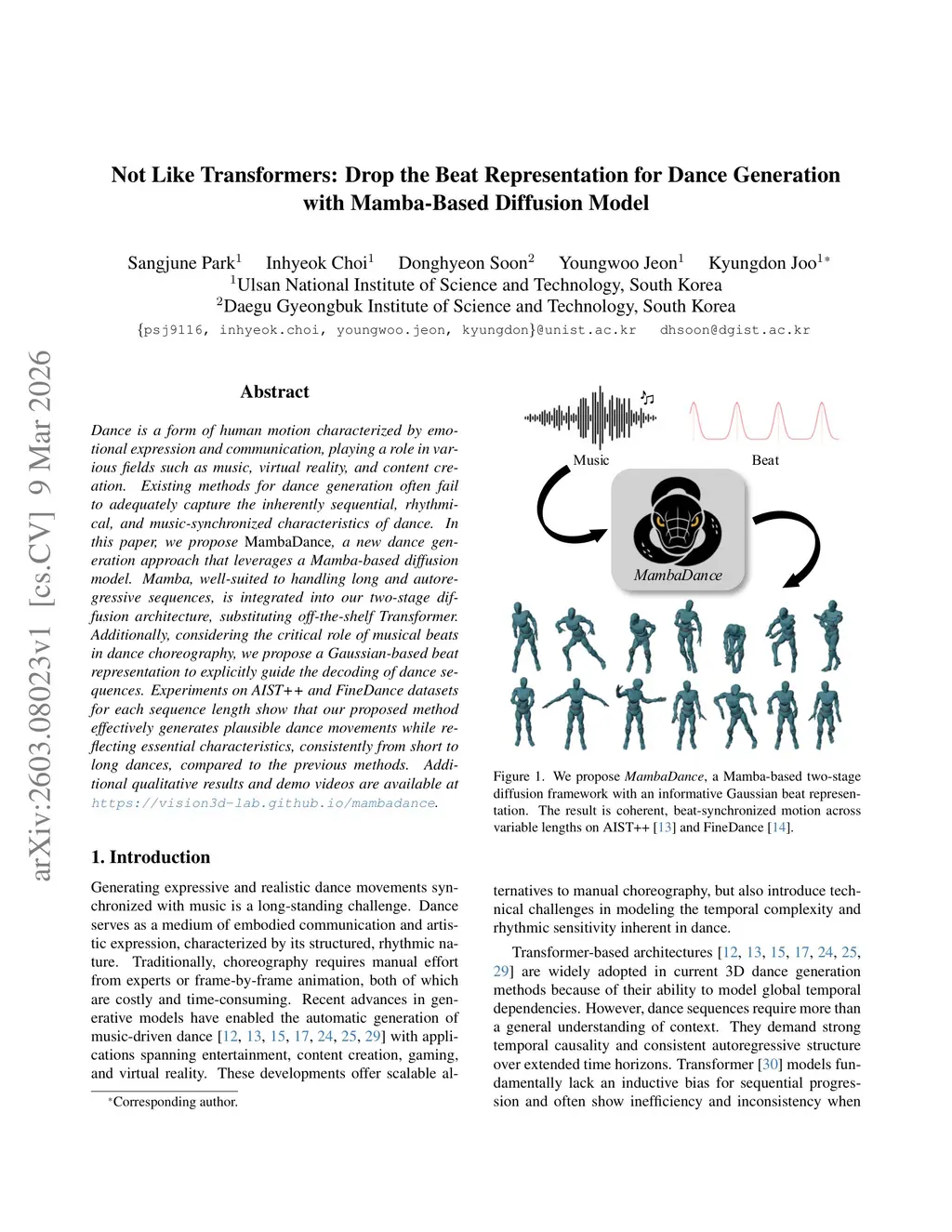 Not Like Transformers: Drop the Beat Representation for Dance Generation with Mamba-Based Diffusion Model