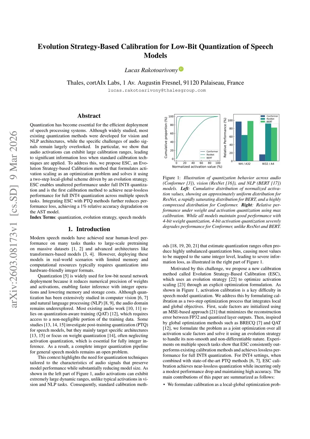 Quantization has become essential for the efficient deployment of speech processing systems. Although widely studied, most existing quantization methods were developed for vision and NLP architectures, while the specific challenges of audio signals remain largely overlooked. In particular, we show that audio activations can exhibit large calibration ranges, leading to significant information loss when standard calibration techniques are applied. To address this, we propose ESC, an Evolution Strategy-based Calibration method that formulates activation scaling as an optimization problem and solves it using a two-step local-global scheme driven by an evolution strategy. ESC enables unaltered performance under full INT8 quantization and is the first calibration method to achieve near-lossless performance for full INT4 quantization across multiple speech tasks. Integrating ESC with PTQ methods further reduces performance loss, achieving a 1% relative accuracy degradation on the AST model.