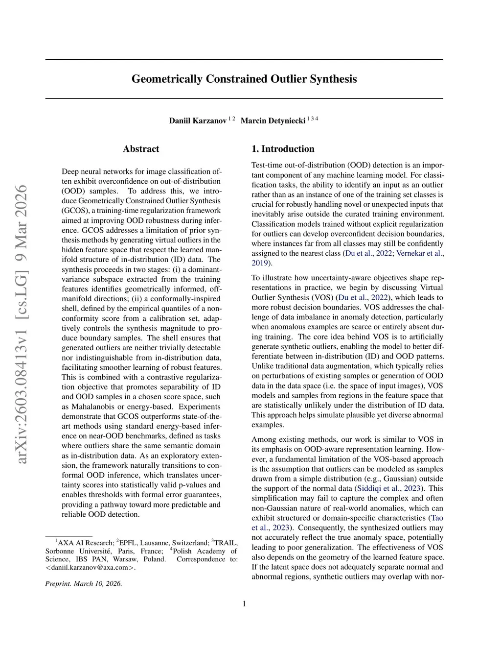 Deep neural networks for image classification often exhibit overconfidence on out-of-distribution (OOD) samples. To address this, we introduce Geometrically Constrained Outlier Synthesis (GCOS), a training-time regularization framework aimed at improving OOD robustness during inference. GCOS addresses a limitation of prior synthesis methods by generating virtual outliers in the hidden feature space that respect the learned manifold structure of in-distribution (ID) data. The synthesis proceeds in two stages: (i) a dominant-variance subspace extracted from the training features identifies geometrically informed, off-manifold directions; (ii) a conformally-inspired shell, defined by the empirical quantiles of a nonconformity score from a calibration set, adaptively controls the synthesis magnitude to produce boundary samples. The shell ensures that generated outliers are neither trivially detectable nor indistinguishable from in-distribution data, facilitating smoother learning of robust features. This is combined with a contrastive regularization objective that promotes separability of ID and OOD samples in a chosen score space, such as Mahalanobis or energy-based. Experiments demonstrate that GCOS outperforms state-of-the-art methods using standard energy-based inference on near-OOD benchmarks, defined as tasks where outliers share the same semantic domain as in-distribution data. As an exploratory extension, the framework naturally transitions to conformal OOD inference, which translates uncertainty scores into statistically valid p-values and enables thresholds with formal error guarantees, providing a pathway toward more predictable and reliable OOD detection.