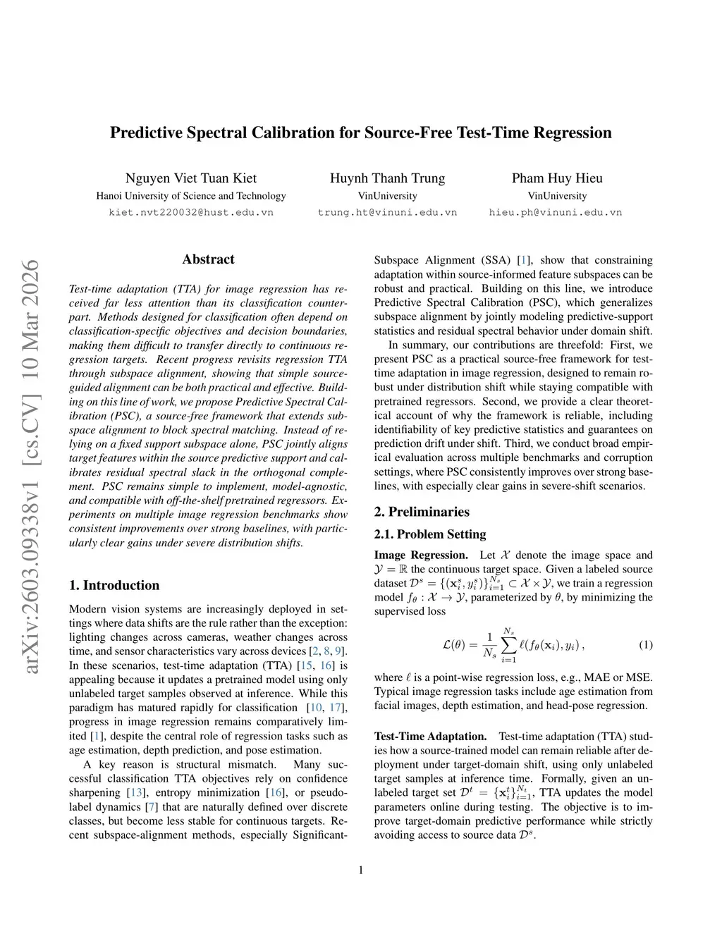 Test-time adaptation (TTA) for image regression has received far less attention than its classification counterpart. Methods designed for classification often depend on classification-specific objectives and decision boundaries, making them difficult to transfer directly to continuous regression targets. Recent progress revisits regression TTA through subspace alignment, showing that simple source-guided alignment can be both practical and effective. Building on this line of work, we propose Predictive Spectral Calibration (PSC), a source-free framework that extends subspace alignment to block spectral matching. Instead of relying on a fixed support subspace alone, PSC jointly aligns target features within the source predictive support and calibrates residual spectral slack in the orthogonal complement. PSC remains simple to implement, model-agnostic, and compatible with off-the-shelf pretrained regressors. Experiments on multiple image regression benchmarks show consistent improvements over strong baselines, with particularly clear gains under severe distribution shifts.
