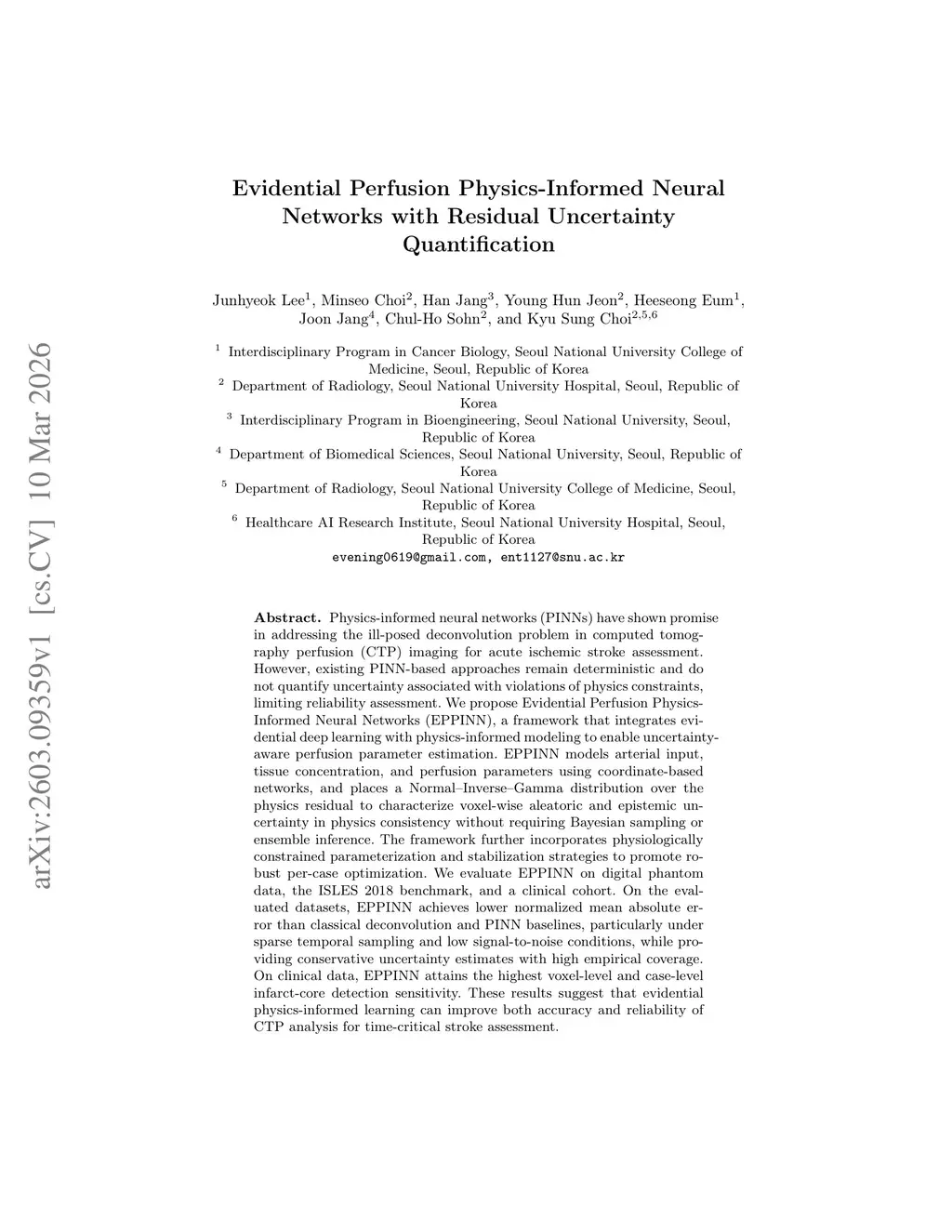 Physics-informed neural networks (PINNs) have shown promise in addressing the ill-posed deconvolution problem in computed tomography perfusion (CTP) imaging for acute ischemic stroke assessment. However, existing PINN-based approaches remain deterministic and do not quantify uncertainty associated with violations of physics constraints, limiting reliability assessment. We propose Evidential Perfusion Physics-Informed Neural Networks (EPPINN), a framework that integrates evidential deep learning with physics-informed modeling to enable uncertainty-aware perfusion parameter estimation. EPPINN models arterial input, tissue concentration, and perfusion parameters using coordinate-based networks, and places a Normal--Inverse--Gamma distribution over the physics residual to characterize voxel-wise aleatoric and epistemic uncertainty in physics consistency without requiring Bayesian sampling or ensemble inference. The framework further incorporates physiologically constrained parameterization and stabilization strategies to promote robust per-case optimization. We evaluate EPPINN on digital phantom data, the ISLES 2018 benchmark, and a clinical cohort. On the evaluated datasets, EPPINN achieves lower normalized mean absolute error than classical deconvolution and PINN baselines, particularly under sparse temporal sampling and low signal-to-noise conditions, while providing conservative uncertainty estimates with high empirical coverage. On clinical data, EPPINN attains the highest voxel-level and case-level infarct-core detection sensitivity. These results suggest that evidential physics-informed learning can improve both accuracy and reliability of CTP analysis for time-critical stroke assessment.