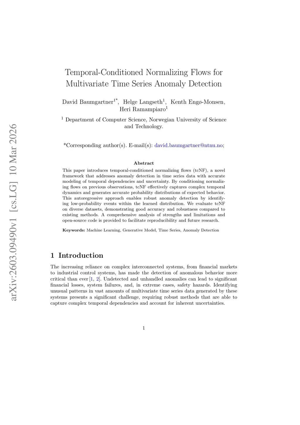 This paper introduces temporal-conditioned normalizing flows (tcNF), a novel framework that addresses anomaly detection in time series data with accurate modeling of temporal dependencies and uncertainty. By conditioning normalizing flows on previous observations, tcNF effectively captures complex temporal dynamics and generates accurate probability distributions of expected behavior. This autoregressive approach enables robust anomaly detection by identifying low-probability events within the learned distribution. We evaluate tcNF on diverse datasets, demonstrating good accuracy and robustness compared to existing methods. A comprehensive analysis of strengths and limitations and open-source code is provided to facilitate reproducibility and future research.