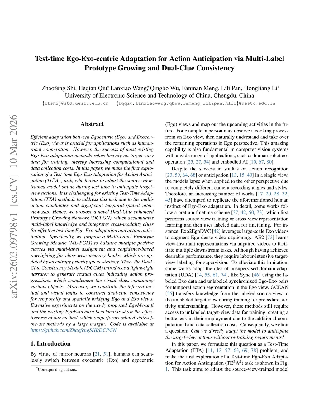 Efficient adaptation between Egocentric (Ego) and Exocentric (Exo) views is crucial for applications such as human-robot cooperation. However, the success of most existing Ego-Exo adaptation methods relies heavily on target-view data for training, thereby increasing computational and data collection costs. In this paper, we make the first exploration of a Test-time Ego-Exo Adaptation for Action Anticipation (TEA) task, which aims to adjust the source-view-trained model online during test time to anticipate target-view actions. It is challenging for existing Test-Time Adaptation (TTA) methods to address this task due to the multi-action candidates and significant temporal-spatial inter-view gap. Hence, we propose a novel Dual-Clue enhanced Prototype Growing Network (DCPGN), which accumulates multi-label knowledge and integrates cross-modality clues for effective test-time Ego-Exo adaptation and action anticipation. Specifically, we propose a Multi-Label Prototype Growing Module (ML-PGM) to balance multiple positive classes via multi-label assignment and confidence-based reweighting for class-wise memory banks, which are updated by an entropy priority queue strategy. Then, the Dual-Clue Consistency Module (DCCM) introduces a lightweight narrator to generate textual clues indicating action progressions, which complement the visual clues containing various objects. Moreover, we constrain the inferred textual and visual logits to construct dual-clue consistency for temporally and spatially bridging Ego and Exo views. Extensive experiments on the newly proposed EgoMe-anti and the existing EgoExoLearn benchmarks show the effectiveness of our method, which outperforms related state-of-the-art methods by a large margin. Code is available at \href{this https URL}{this https URL}.
