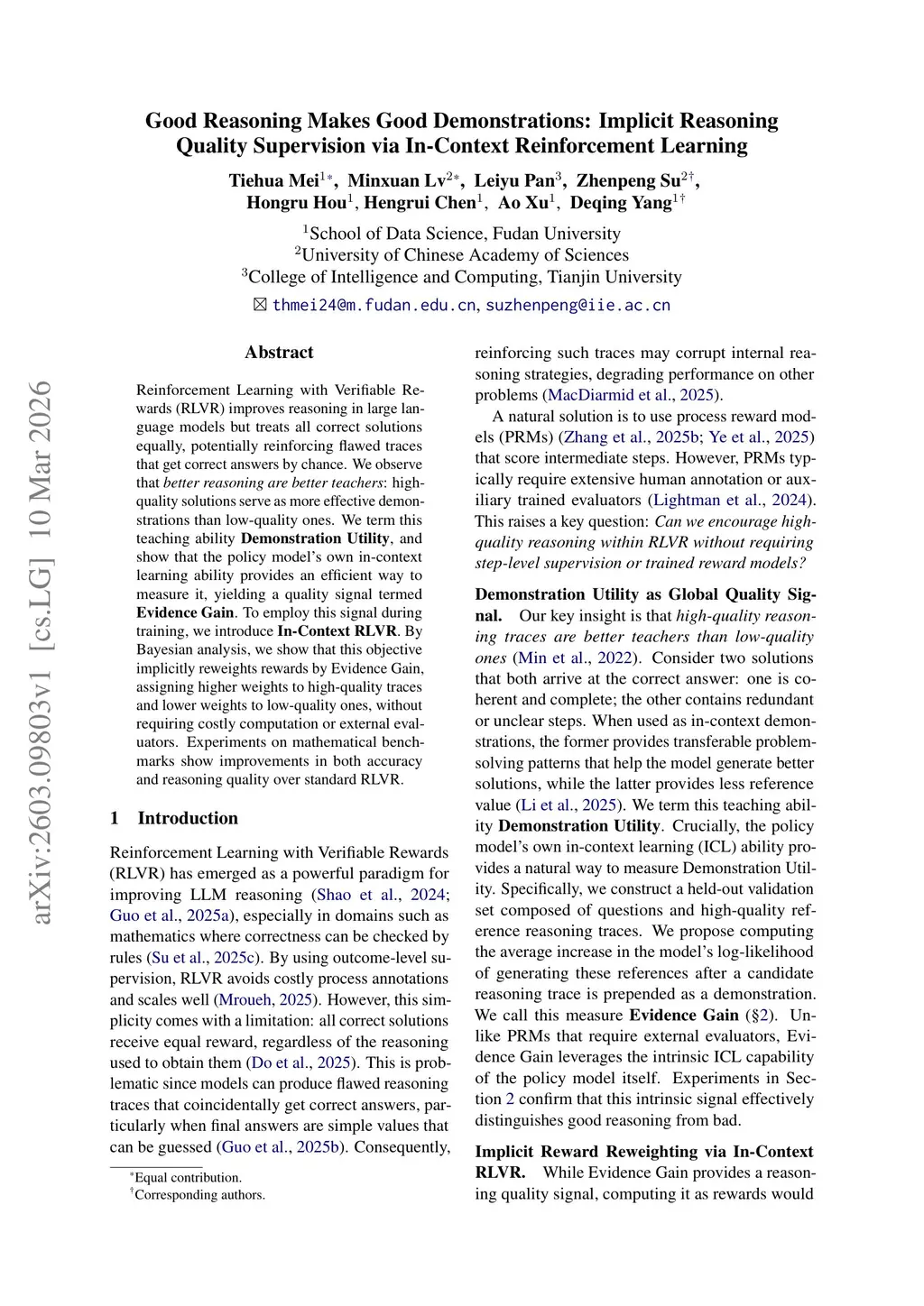 Reinforcement Learning with Verifiable Rewards (RLVR) improves reasoning in large language models but treats all correct solutions equally, potentially reinforcing flawed traces that get correct answers by chance. We observe that better reasoning are better teachers: high-quality solutions serve as more effective demonstrations than low-quality ones. We term this teaching ability Demonstration Utility, and show that the policy model's own in-context learning ability provides an efficient way to measure it, yielding a quality signal termed Evidence Gain. To employ this signal during training, we introduce In-Context RLVR. By Bayesian analysis, we show that this objective implicitly reweights rewards by Evidence Gain, assigning higher weights to high-quality traces and lower weights to low-quality ones, without requiring costly computation or external evaluators. Experiments on mathematical benchmarks show improvements in both accuracy and reasoning quality over standard RLVR.