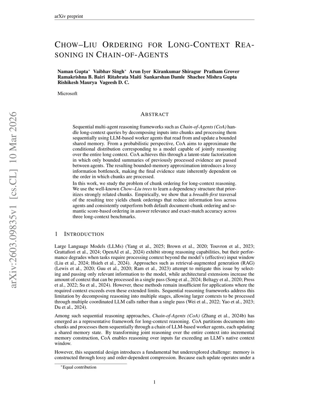 Sequential multi-agent reasoning frameworks such as Chain-of-Agents (CoA) handle long-context queries by decomposing inputs into chunks and processing them sequentially using LLM-based worker agents that read from and update a bounded shared memory. From a probabilistic perspective, CoA aims to approximate the conditional distribution corresponding to a model capable of jointly reasoning over the entire long context. CoA achieves this through a latent-state factorization in which only bounded summaries of previously processed evidence are passed between agents. The resulting bounded-memory approximation introduces a lossy information bottleneck, making the final evidence state inherently dependent on the order in which chunks are processed.In this work, we study the problem of chunk ordering for long-context reasoning. We use the well-known Chow-Liu trees to learn a dependency structure that prioritizes strongly related chunks. Empirically, we show that a breadth-first traversal of the resulting tree yields chunk orderings that reduce information loss across agents and consistently outperform both default document-chunk ordering and semantic score-based ordering in answer relevance and exact-match accuracy across three long-context benchmarks.