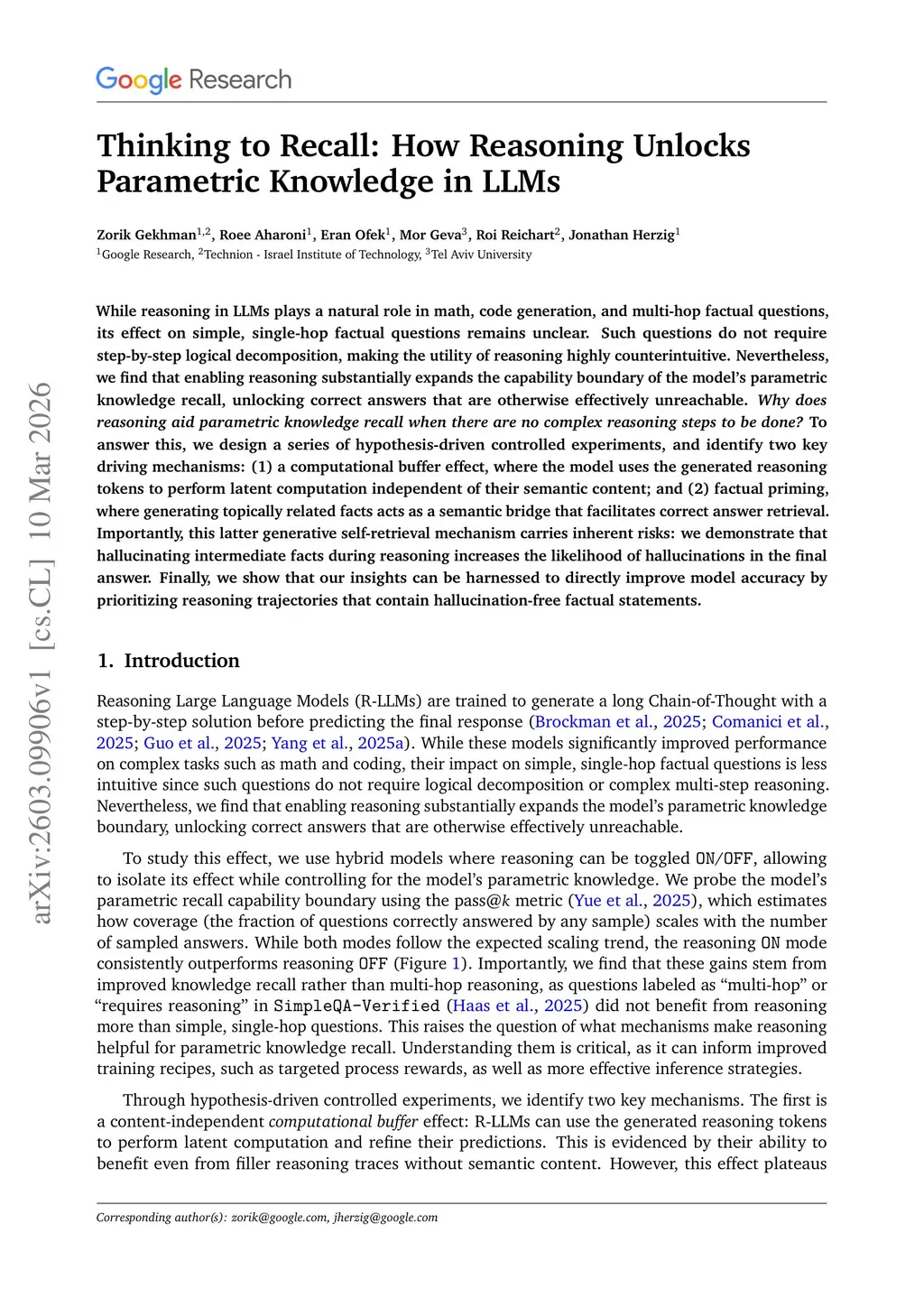 While reasoning in LLMs plays a natural role in math, code generation, and multi-hop factual questions, its effect on simple, single-hop factual questions remains unclear. Such questions do not require step-by-step logical decomposition, making the utility of reasoning highly counterintuitive. Nevertheless, we find that enabling reasoning substantially expands the capability boundary of the model's parametric knowledge recall, unlocking correct answers that are otherwise effectively unreachable. Why does reasoning aid parametric knowledge recall when there are no complex reasoning steps to be done? To answer this, we design a series of hypothesis-driven controlled experiments, and identify two key driving mechanisms: (1) a computational buffer effect, where the model uses the generated reasoning tokens to perform latent computation independent of their semantic content; and (2) factual priming, where generating topically related facts acts as a semantic bridge that facilitates correct answer retrieval. Importantly, this latter generative self-retrieval mechanism carries inherent risks: we demonstrate that hallucinating intermediate facts during reasoning increases the likelihood of hallucinations in the final answer. Finally, we show that our insights can be harnessed to directly improve model accuracy by prioritizing reasoning trajectories that contain hallucination-free factual statements.