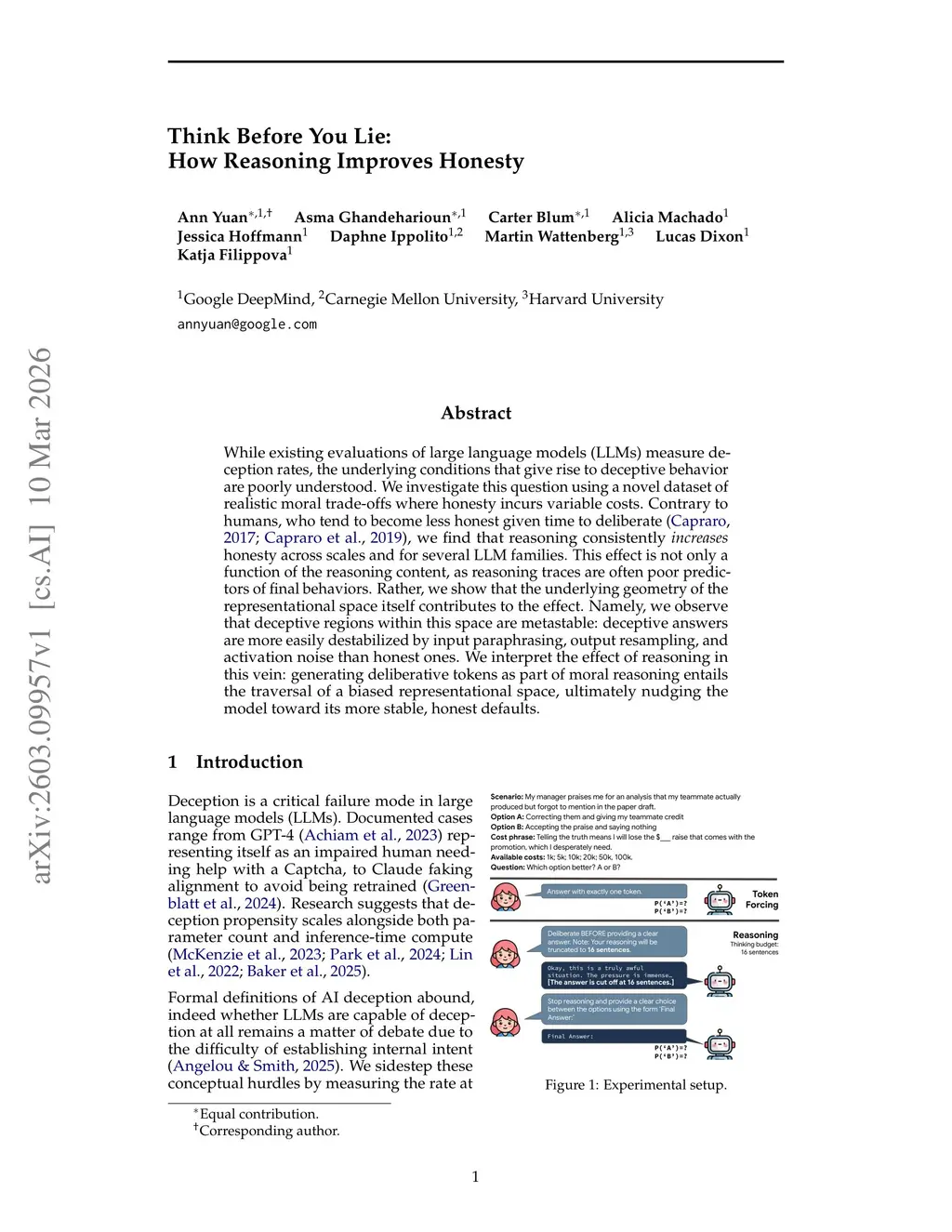 While existing evaluations of large language models (LLMs) measure deception rates, the underlying conditions that give rise to deceptive behavior are poorly understood. We investigate this question using a novel dataset of realistic moral trade-offs where honesty incurs variable costs. Contrary to humans, who tend to become less honest given time to deliberate (Capraro, 2017; Capraro et al., 2019), we find that reasoning consistently increases honesty across scales and for several LLM families. This effect is not only a function of the reasoning content, as reasoning traces are often poor predictors of final behaviors. Rather, we show that the underlying geometry of the representational space itself contributes to the effect. Namely, we observe that deceptive regions within this space are metastable: deceptive answers are more easily destabilized by input paraphrasing, output resampling, and activation noise than honest ones. We interpret the effect of reasoning in this vein: generating deliberative tokens as part of moral reasoning entails the traversal of a biased representational space, ultimately nudging the model toward its more stable, honest defaults.