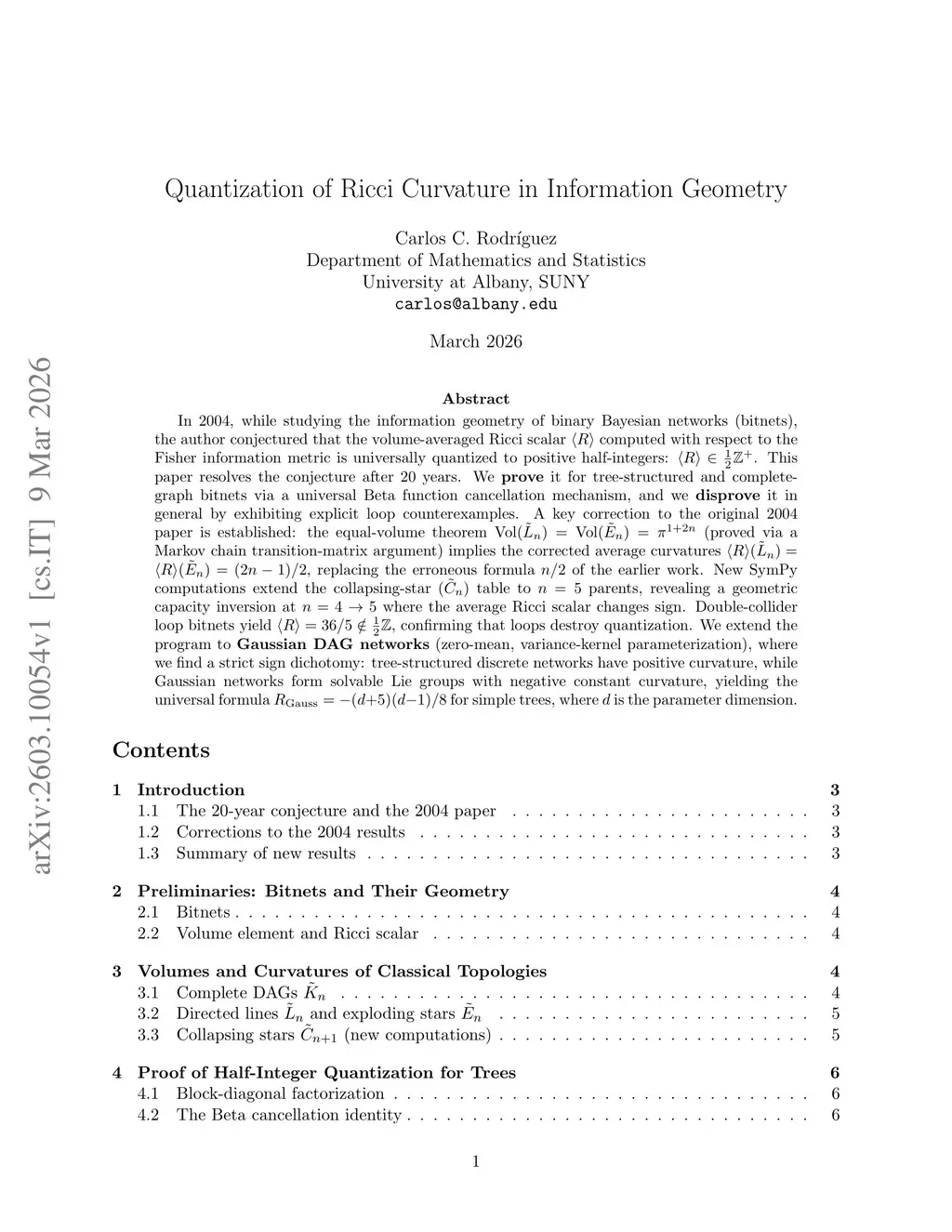 In 2004, while studying the information geometry of binary Bayesian networks (bitnets), the author conjectured that the volume-averaged Ricci scalar <R> computed with respect to the Fisher information metric is universally quantized to positive half-integers: <R> in (1/2)Z. This paper resolves the conjecture after 20 years. We prove it for tree-structured and complete-graph bitnets via a universal Beta function cancellation mechanism, and disprove it in general by exhibiting explicit loop counterexamples.We extend the program to Gaussian DAG networks, where a sign dichotomy holds: discrete bitnets have positive curvature, while Gaussian networks form solvable Lie groups with negative curvature.