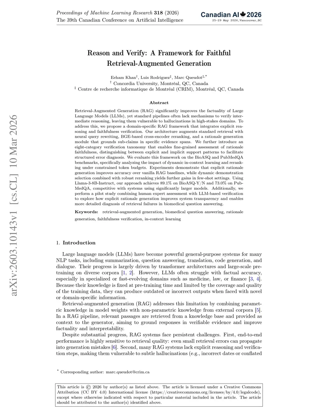 Retrieval-Augmented Generation (RAG) significantly improves the factuality of Large Language Models (LLMs), yet standard pipelines often lack mechanisms to verify inter- mediate reasoning, leaving them vulnerable to hallucinations in high-stakes domains. To address this, we propose a domain-specific RAG framework that integrates explicit rea- soning and faithfulness verification. Our architecture augments standard retrieval with neural query rewriting, BGE-based cross-encoder reranking, and a rationale generation module that grounds sub-claims in specific evidence spans. We further introduce an eight-category verification taxonomy that enables fine-grained assessment of rationale faithfulness, distinguishing between explicit and implicit support patterns to facilitate structured error diagnosis. We evaluate this framework on the BioASQ and PubMedQA benchmarks, specifically analyzing the impact of dynamic in-context learning and rerank- ing under constrained token budgets. Experiments demonstrate that explicit rationale generation improves accuracy over vanilla RAG baselines, while dynamic demonstration selection combined with robust reranking yields further gains in few-shot settings. Using Llama-3-8B-Instruct, our approach achieves 89.1% on BioASQ-Y/N and 73.0% on Pub- MedQA, competitive with systems using significantly larger models. Additionally, we perform a pilot study combining human expert assessment with LLM-based verification to explore how explicit rationale generation improves system transparency and enables more detailed diagnosis of retrieval failures in biomedical question answering.