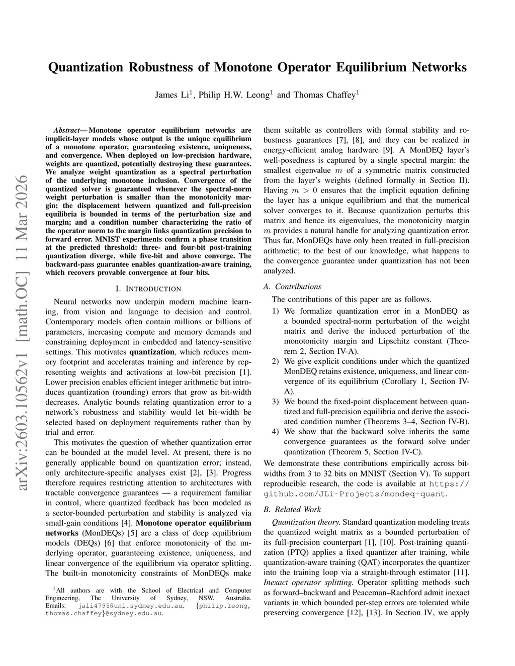 Monotone operator equilibrium networks are implicit-layer models whose output is the unique equilibrium of a monotone operator, guaranteeing existence, uniqueness, and convergence. When deployed on low-precision hardware, weights are quantized, potentially destroying these guarantees. We analyze weight quantization as a spectral perturbation of the underlying monotone inclusion. Convergence of the quantized solver is guaranteed whenever the spectral-norm weight perturbation is smaller than the monotonicity margin; the displacement between quantized and full-precision equilibria is bounded in terms of the perturbation size and margin; and a condition number characterizing the ratio of the operator norm to the margin links quantization precision to forward error. MNIST experiments confirm a phase transition at the predicted threshold: three- and four-bit post-training quantization diverge, while five-bit and above converge. The backward-pass guarantee enables quantization-aware training, which recovers provable convergence at four bits.