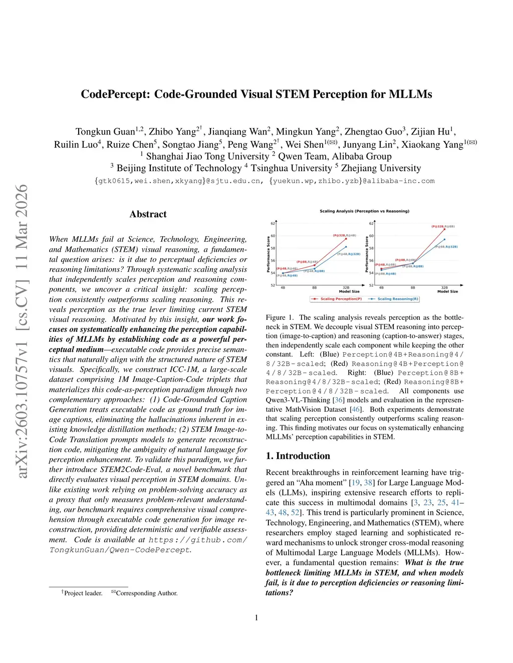 When MLLMs fail at Science, Technology, Engineering, and Mathematics (STEM) visual reasoning, a fundamental question arises: is it due to perceptual deficiencies or reasoning limitations? Through systematic scaling analysis that independently scales perception and reasoning components, we uncover a critical insight: scaling perception consistently outperforms scaling reasoning. This reveals perception as the true lever limiting current STEM visual reasoning. Motivated by this insight, our work focuses on systematically enhancing the perception capabilities of MLLMs by establishing code as a powerful perceptual medium--executable code provides precise semantics that naturally align with the structured nature of STEM visuals. Specifically, we construct ICC-1M, a large-scale dataset comprising 1M Image-Caption-Code triplets that materializes this code-as-perception paradigm through two complementary approaches: (1) Code-Grounded Caption Generation treats executable code as ground truth for image captions, eliminating the hallucinations inherent in existing knowledge distillation methods; (2) STEM Image-to-Code Translation prompts models to generate reconstruction code, mitigating the ambiguity of natural language for perception enhancement. To validate this paradigm, we further introduce STEM2Code-Eval, a novel benchmark that directly evaluates visual perception in STEM domains. Unlike existing work relying on problem-solving accuracy as a proxy that only measures problem-relevant understanding, our benchmark requires comprehensive visual comprehension through executable code generation for image reconstruction, providing deterministic and verifiable assessment. Code is available atthis https URL.
