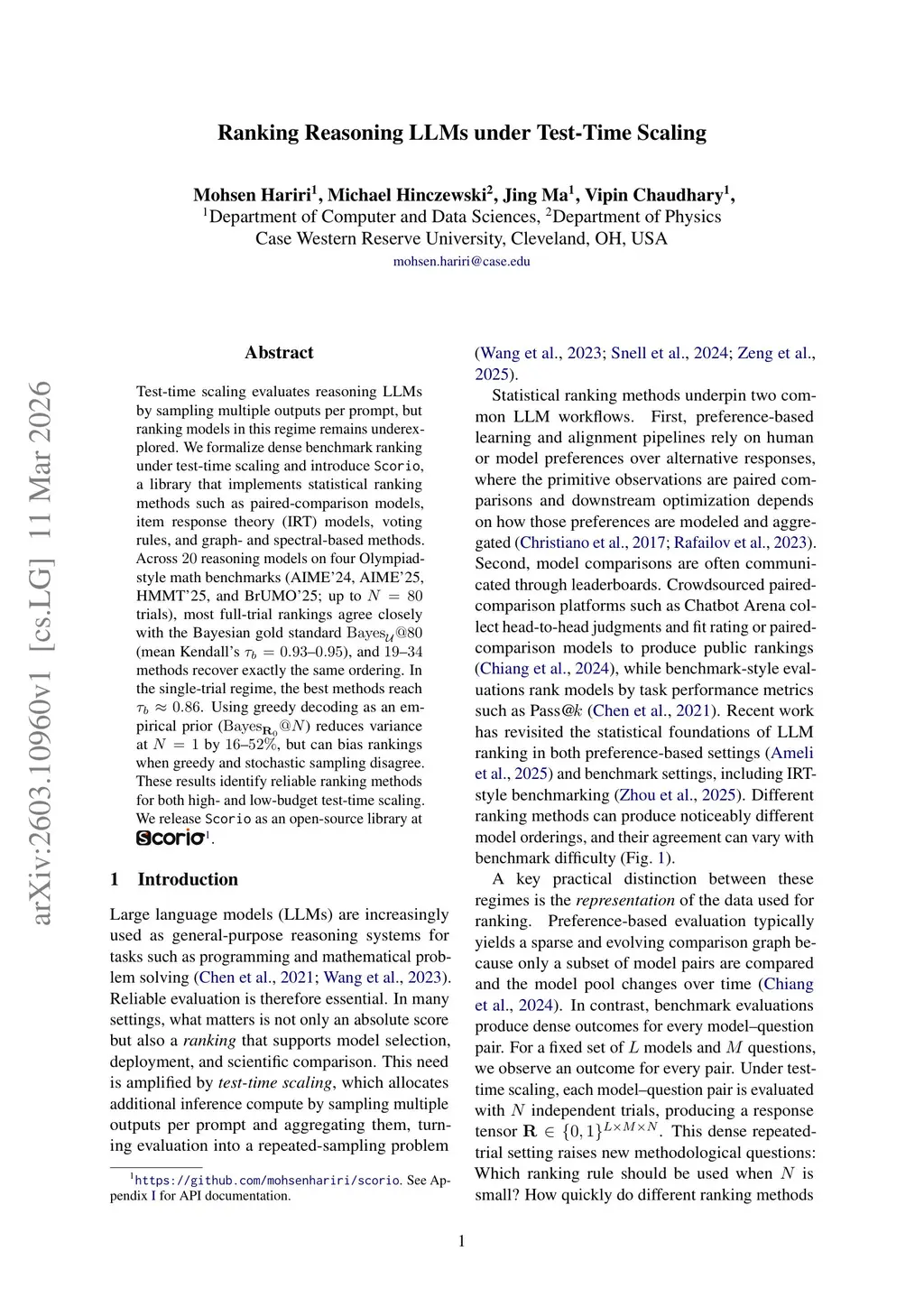 Test-time scaling evaluates reasoning LLMs by sampling multiple outputs per prompt, but ranking models in this regime remains underexplored. We formalize dense benchmark ranking under test-time scaling and introduce Scorio, a library that implements statistical ranking methods such as paired-comparison models, item response theory (IRT) models, voting rules, and graph- and spectral-based methods. Across reasoning models on four Olympiad-style math benchmarks (AIME'24, AIME'25, HMMT'25, and BrUMO'25; up to trials), most full-trial rankings agree closely with the Bayesian gold standard (mean Kendall's --), and -- methods recover exactly the same ordering. In the single-trial regime, the best methods reach . Using greedy decoding as an empirical prior () reduces variance at by --, but can bias rankings when greedy and stochastic sampling disagree. These results identify reliable ranking methods for both high- and low-budget test-time scaling. We release Scorio as an open-source library atthis https URL.
