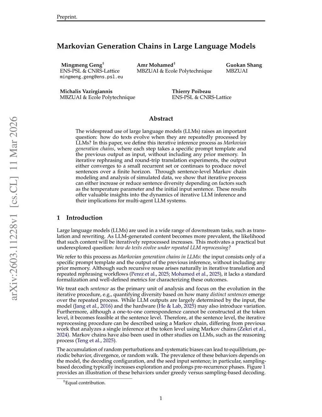 The widespread use of large language models (LLMs) raises an important question: how do texts evolve when they are repeatedly processed by LLMs? In this paper, we define this iterative inference process as Markovian generation chains, where each step takes a specific prompt template and the previous output as input, without including any prior memory. In iterative rephrasing and round-trip translation experiments, the output either converges to a small recurrent set or continues to produce novel sentences over a finite horizon. Through sentence-level Markov chain modeling and analysis of simulated data, we show that iterative process can either increase or reduce sentence diversity depending on factors such as the temperature parameter and the initial input sentence. These results offer valuable insights into the dynamics of iterative LLM inference and their implications for multi-agent LLM systems.