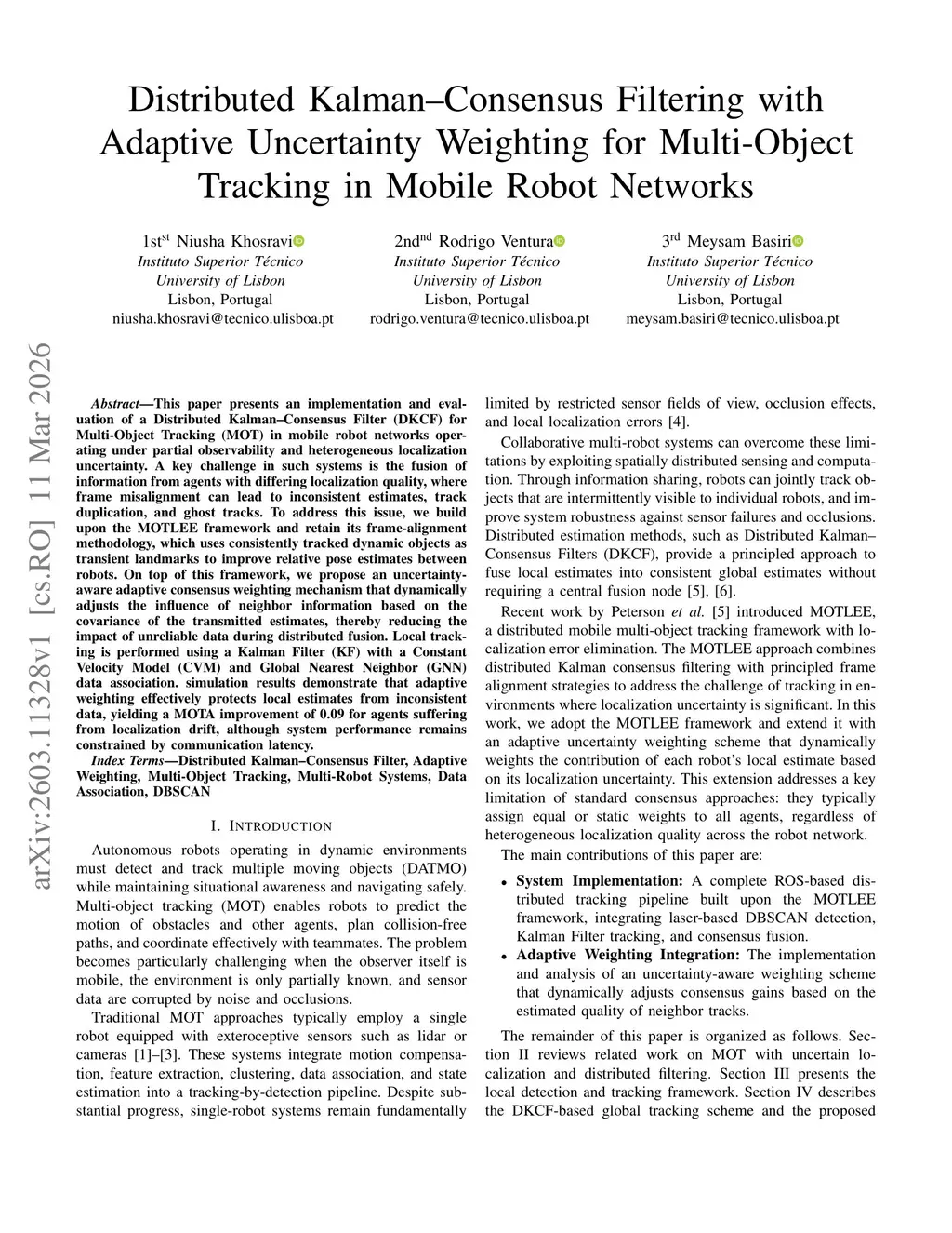 Distributed Kalman--Consensus Filtering with Adaptive Uncertainty Weighting for Multi-Object Tracking in Mobile Robot Networks