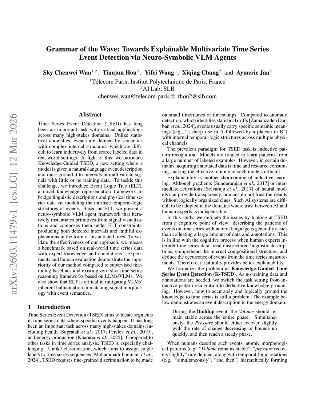 Time Series Event Detection (TSED) has long been an important task with critical applications across many high-stakes domains. Unlike statistical anomalies, events are defined by semantics with complex internal structures, which are difficult to learn inductively from scarce labeled data in real-world settings. In light of this, we introduce Knowledge-Guided TSED, a new setting where a model is given a natural-language event description and must ground it to intervals in multivariate signals with little or no training data. To tackle this challenge, we introduce Event Logic Tree (ELT), a novel knowledge representation framework to bridge linguistic descriptions and physical time series data via modeling the intrinsic temporal-logic structures of events. Based on ELT, we present a neuro-symbolic VLM agent framework that iteratively instantiates primitives from signal visualizations and composes them under ELT constraints, producing both detected intervals and faithful explanations in the form of instantiated trees. To validate the effectiveness of our approach, we release a benchmark based on real-world time series data with expert knowledge and annotations. Experiments and human evaluation demonstrate the superiority of our method compared to supervised fine-tuning baselines and existing zero-shot time series reasoning frameworks based on LLMs/VLMs. We also show that ELT is critical in mitigating VLMs' inherent hallucination in matching signal morphology with event semantics.