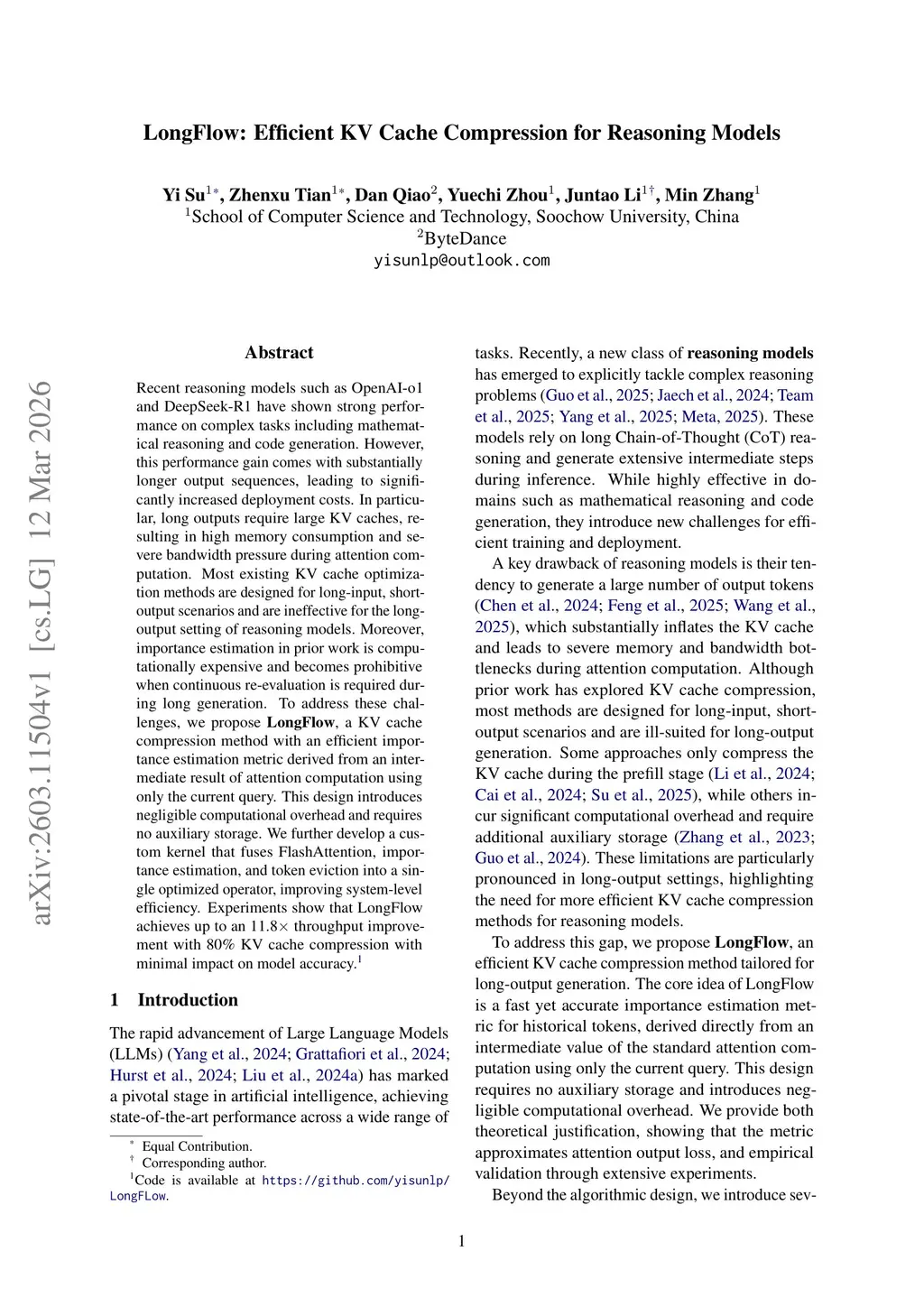 Recent reasoning models such as OpenAI-o1 and DeepSeek-R1 have shown strong performance on complex tasks including mathematical reasoning and code generation. However, this performance gain comes with substantially longer output sequences, leading to significantly increased deployment costs. In particular, long outputs require large KV caches, resulting in high memory consumption and severe bandwidth pressure during attention computation. Most existing KV cache optimization methods are designed for long-input, short-output scenarios and are ineffective for the long-output setting of reasoning models. Moreover, importance estimation in prior work is computationally expensive and becomes prohibitive when continuous re-evaluation is required during long generation. To address these challenges, we propose LongFlow, a KV cache compression method with an efficient importance estimation metric derived from an intermediate result of attention computation using only the current query. This design introduces negligible computational overhead and requires no auxiliary storage. We further develop a custom kernel that fuses FlashAttention, importance estimation, and token eviction into a single optimized operator, improving system-level efficiency. Experiments show that LongFlow achieves up to an 11.8 times throughput improvement with 80% KV cache compression with minimal impact on model accuracy.