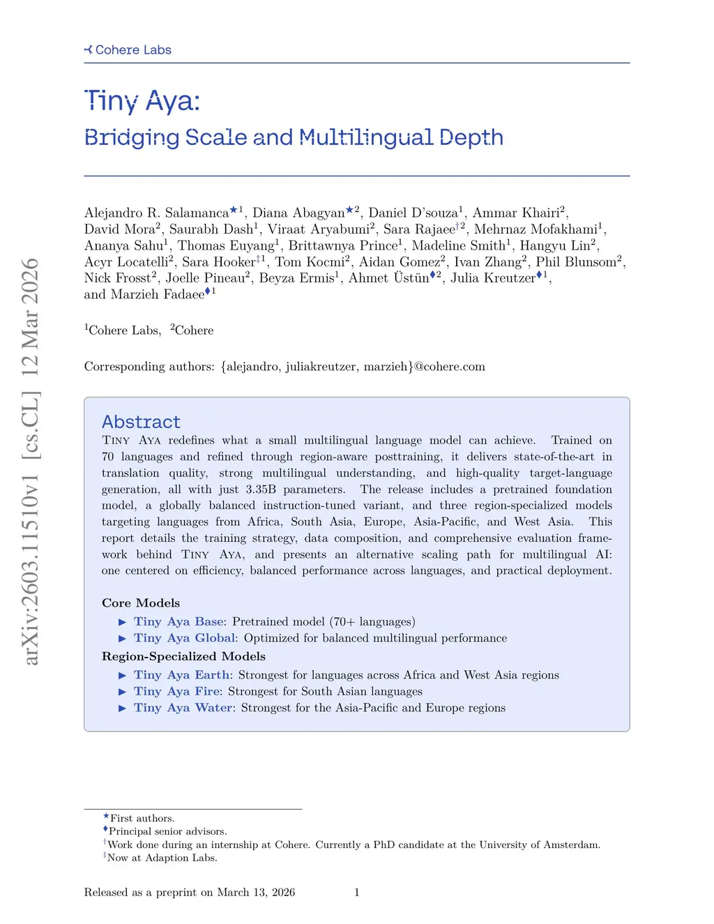 Tiny Aya redefines what a small multilingual language model can achieve. Trained on 70 languages and refined through region-aware posttraining, it delivers state-of-the-art in translation quality, strong multilingual understanding, and high-quality target-language generation, all with just 3.35B parameters. The release includes a pretrained foundation model, a globally balanced instruction-tuned variant, and three region-specialized models targeting languages from Africa, South Asia, Europe, Asia-Pacific, and West Asia. This report details the training strategy, data composition, and comprehensive evaluation framework behind Tiny Aya, and presents an alternative scaling path for multilingual AI: one centered on efficiency, balanced performance across languages, and practical deployment.