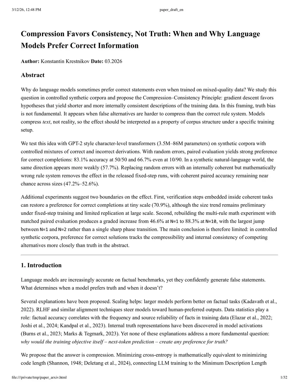 Why do language models trained on contradictory data prefer correct answers? In controlled experiments with small transformers (3.5M--86M parameters), we show that this preference tracks the compressibility structure of errors rather than truth per se. We train GPT-2 style models on corpora where each mathematical problem appears with both correct and incorrect solutions -- a denoising design that directly models conflicting information about the same fact. When errors are random, models extract the correct signal with accuracy scaling from 65% to 85% with model size. When errors follow a coherent alternative rule system, accuracy drops to chance (~45--51%): the model cannot distinguish the false system from truth. A multi-rule experiment reveals a sharp crossover: a single coherent alternative rule eliminates truth bias entirely, but adding a second competing rule restores most of it (47%->78%), with continued growth through N=10 (88%). The same pattern reproduces on real Wikipedia text (71% vs 46%). We propose the Compression--Consistency Principle as an explanatory hypothesis: in these settings, gradient descent favors the most compressible answer cluster, not truth per se. Truth bias emerges only when falsehood is structurally incoherent. Whether this principle extends to large-scale pretraining remains an open question.