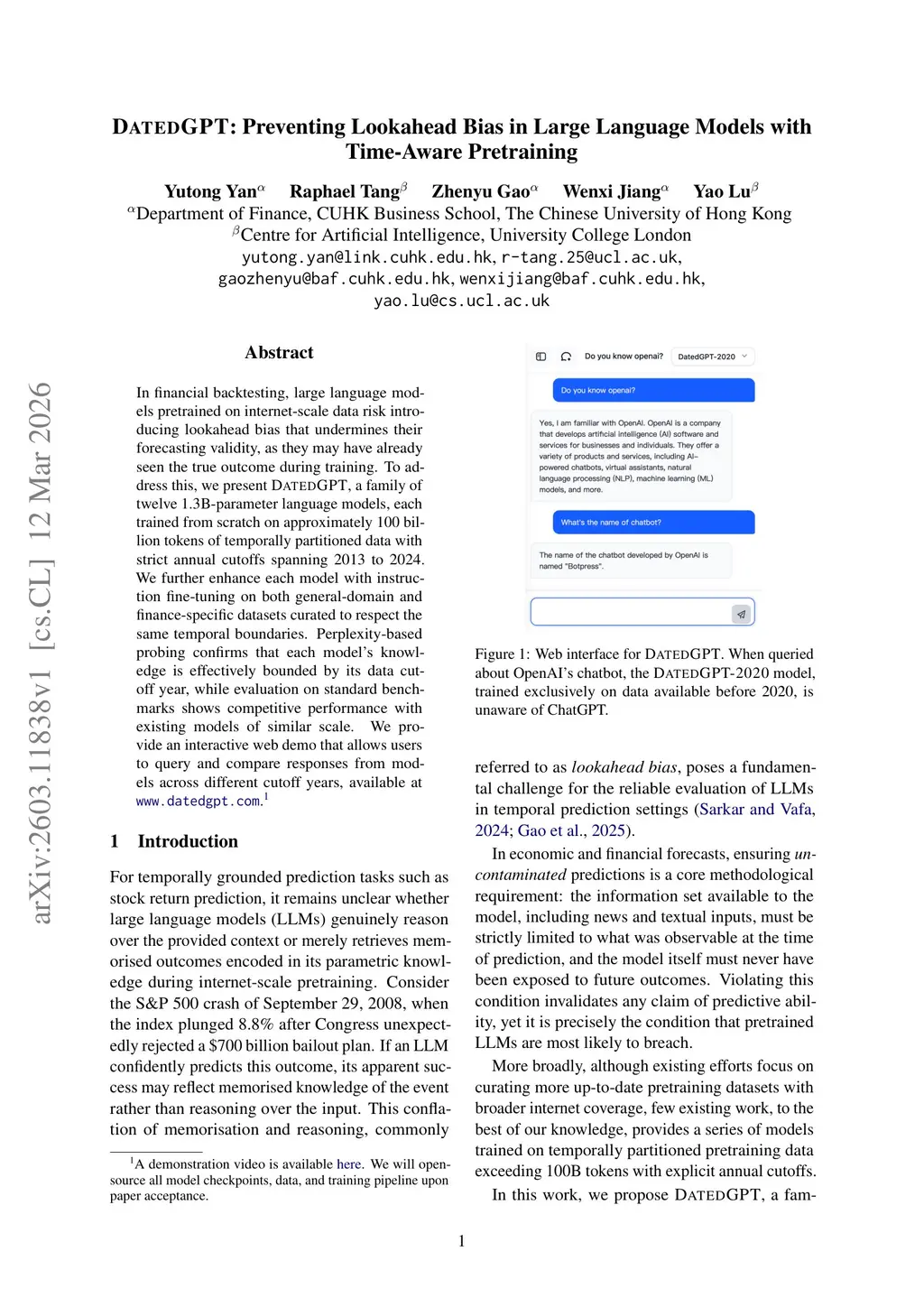 In financial backtesting, large language models pretrained on internet-scale data risk introducing lookahead bias that undermines their forecasting validity, as they may have already seen the true outcome during training. To address this, we present DatedGPT, a family of twelve 1.3B-parameter language models, each trained from scratch on approximately 100 billion tokens of temporally partitioned data with strict annual cutoffs spanning 2013 to 2024. We further enhance each model with instruction fine-tuning on both general-domain and finance-specific datasets curated to respect the same temporal boundaries. Perplexity-based probing confirms that each model's knowledge is effectively bounded by its data cutoff year, while evaluation on standard benchmarks shows competitive performance with existing models of similar scale. We provide an interactive web demo that allows users to query and compare responses from models across different cutoff years.