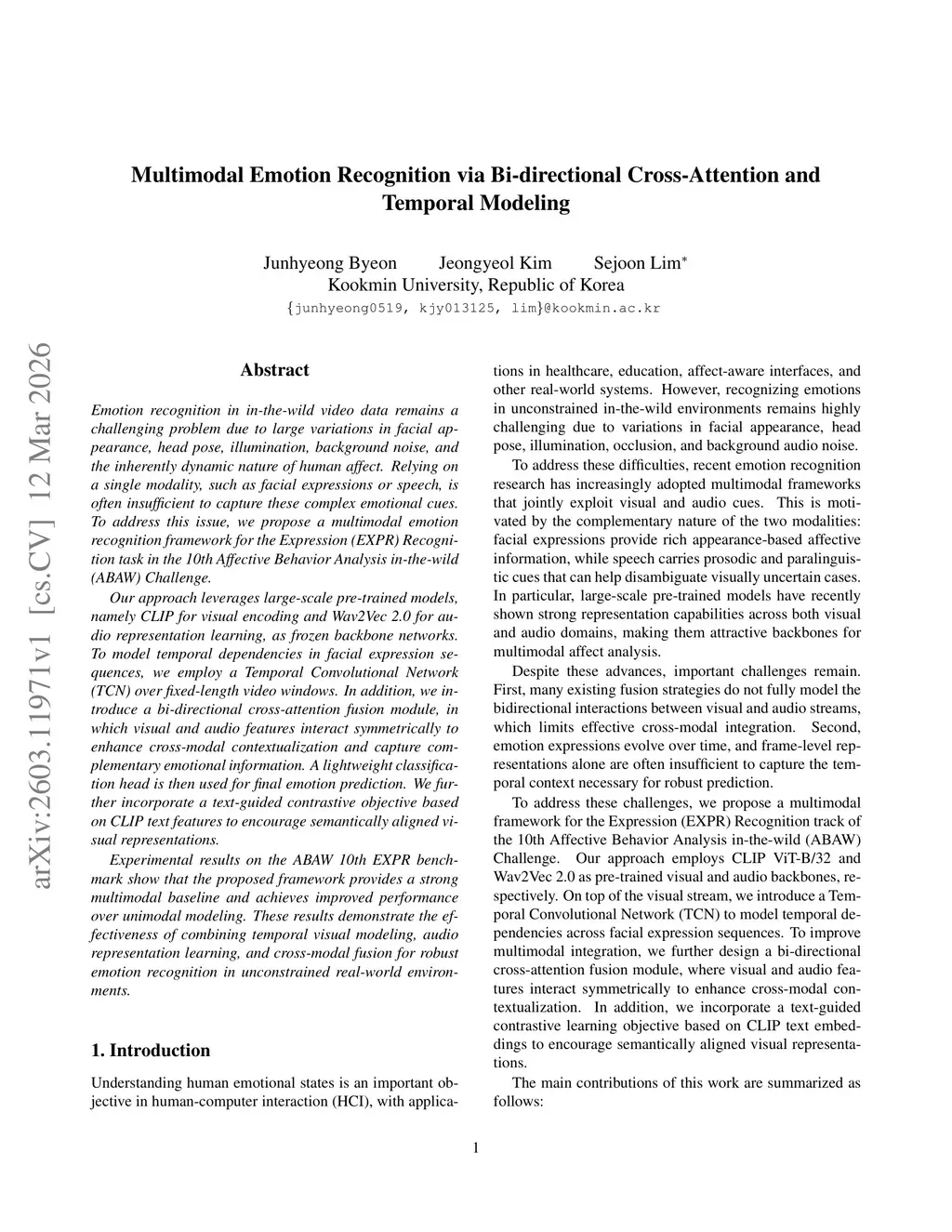 Expression recognition in in-the-wild video data remains challenging due to substantial variations in facial appearance, background conditions, audio noise, and the inherently dynamic nature of human affect. Relying on a single modality, such as facial expressions or speech, is often insufficient for capturing these complex emotional cues. To address this limitation, we propose a multimodal emotion recognition framework for the Expression (EXPR) task in the 10th Affective Behavior Analysis in-the-wild (ABAW) Challenge. Our framework builds on large-scale pre-trained models for visual and audio representation learning and integrates them in a unified multimodal architecture. To better capture temporal patterns in facial expression sequences, we incorporate temporal visual modeling over video windows. We further introduce a bi-directional cross-attention fusion module that enables visual and audio features to interact in a symmetric manner, facilitating cross-modal contextualization and complementary emotion understanding. In addition, we employ a text-guided contrastive objective to encourage semantically meaningful visual representations through alignment with emotion-related text prompts. Experimental results on the ABAW 10th EXPR benchmark demonstrate the effectiveness of the proposed framework, achieving a Macro F1 score of 0.32 compared to the baseline score of 0.25, and highlight the benefit of combining temporal visual modeling, audio representation learning, and cross-modal fusion for robust emotion recognition in unconstrained real-world environments.