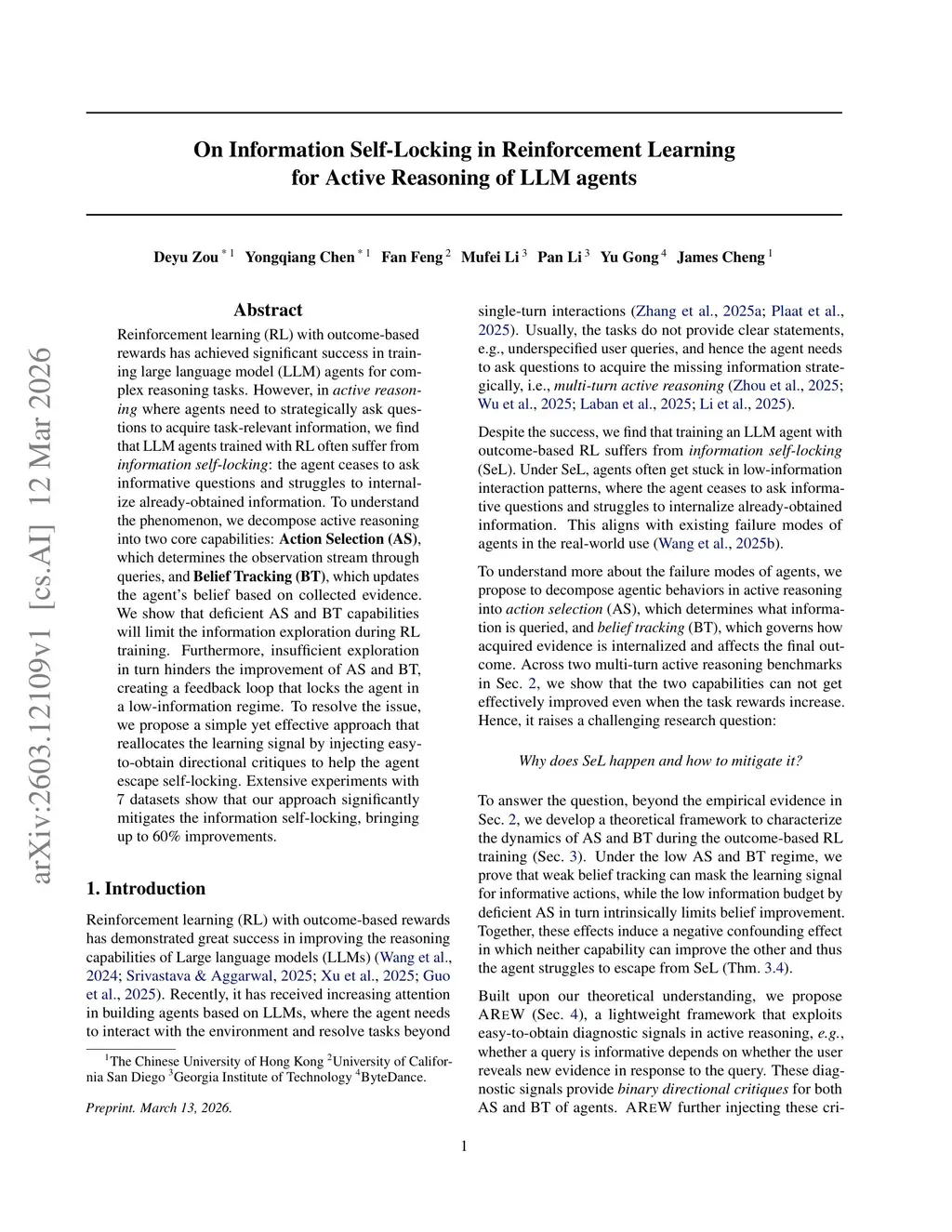 Reinforcement learning (RL) with outcome-based rewards has achieved significant success in training large language model (LLM) agents for complex reasoning tasks. However, in active reasoning where agents need to strategically ask questions to acquire task-relevant information, we find that LLM agents trained with RL often suffer from information self-locking: the agent ceases to ask informative questions and struggles to internalize already-obtained information. To understand the phenomenon, we decompose active reasoning into two core capabilities: Action Selection (AS), which determines the observation stream through queries, and Belief Tracking (BT), which updates the agent's belief based on collected evidence. We show that deficient AS and BT capabilities will limit the information exploration during RL training. Furthermore, insufficient exploration in turn hinders the improvement of AS and BT, creating a feedback loop that locks the agent in a low-information regime. To resolve the issue, we propose a simple yet effective approach that reallocates the learning signal by injecting easy- to-obtain directional critiques to help the agent escape self-locking. Extensive experiments with 7 datasets show that our approach significantly mitigates the information self-locking, bringing up to 60% improvements.