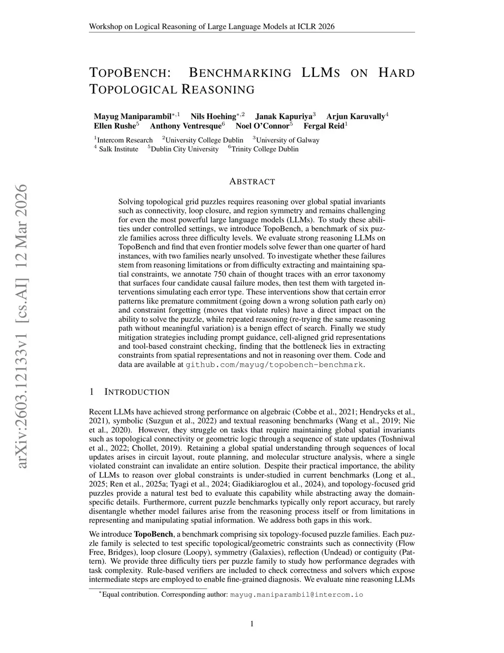 Solving topological grid puzzles requires reasoning over global spatial invariants such as connectivity, loop closure, and region symmetry and remains challenging for even the most powerful large language models (LLMs). To study these abilities under controlled settings, we introduce TopoBench, a benchmark of six puzzle families across three difficulty levels. We evaluate strong reasoning LLMs on TopoBench and find that even frontier models solve fewer than one quarter of hard instances, with two families nearly unsolved. To investigate whether these failures stem from reasoning limitations or from difficulty extracting and maintaining spatial constraints, we annotate 750 chain of thought traces with an error taxonomy that surfaces four candidate causal failure modes, then test them with targeted interventions simulating each error type. These interventions show that certain error patterns like premature commitment and constraint forgetting have a direct impact on the ability to solve the puzzle, while repeated reasoning is a benign effect of search. Finally we study mitigation strategies including prompt guidance, cell-aligned grid representations and tool-based constraint checking, finding that the bottleneck lies in extracting constraints from spatial representations and not in reasoning over them. Code and data are available atthis http URL.