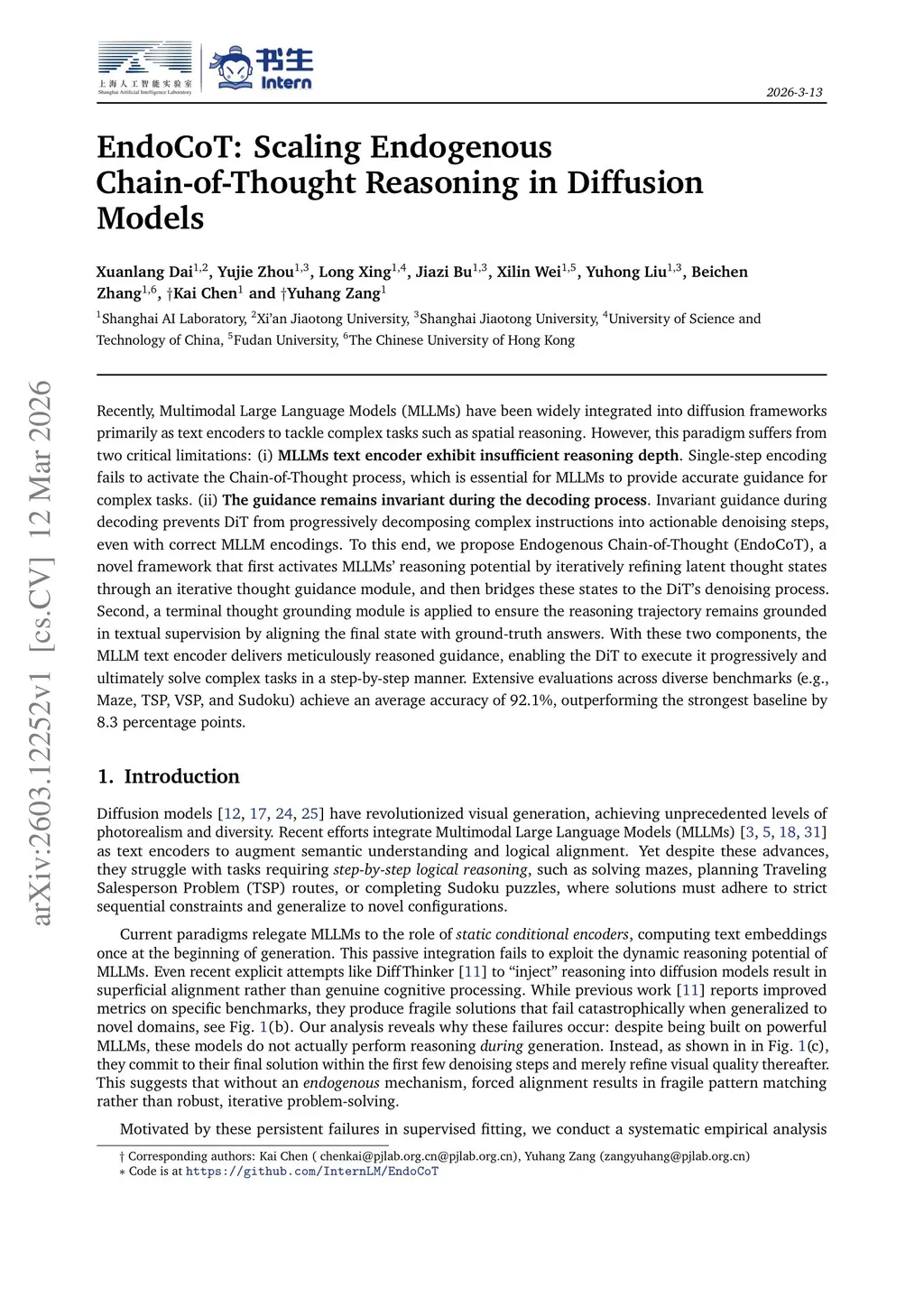 Recently, Multimodal Large Language Models (MLLMs) have been widely integrated into diffusion frameworks primarily as text encoders to tackle complex tasks such as spatial reasoning. However, this paradigm suffers from two critical limitations: (i) MLLMs text encoder exhibits insufficient reasoning depth. Single-step encoding fails to activate the Chain-of-Thought process, which is essential for MLLMs to provide accurate guidance for complex tasks. (ii) The guidance remains invariant during the decoding process. Invariant guidance during decoding prevents DiT from progressively decomposing complex instructions into actionable denoising steps, even with correct MLLM encodings. To this end, we propose Endogenous Chain-of-Thought (EndoCoT), a novel framework that first activates MLLMs' reasoning potential by iteratively refining latent thought states through an iterative thought guidance module, and then bridges these states to the DiT's denoising process. Second, a terminal thought grounding module is applied to ensure the reasoning trajectory remains grounded in textual supervision by aligning the final state with ground-truth answers. With these two components, the MLLM text encoder delivers meticulously reasoned guidance, enabling the DiT to execute it progressively and ultimately solve complex tasks in a step-by-step manner. Extensive evaluations across diverse benchmarks (e.g., Maze, TSP, VSP, and Sudoku) achieve an average accuracy of 92.1%, outperforming the strongest baseline by 8.3 percentage points. The code and dataset are publicly available atthis https URL.