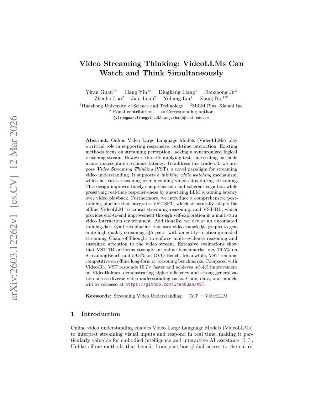Online Video Large Language Models (VideoLLMs) play a critical role in supporting responsive, real-time interaction. Existing methods focus on streaming perception, lacking a synchronized logical reasoning stream. However, directly applying test-time scaling methods incurs unacceptable response latency. To address this trade-off, we propose Video Streaming Thinking (VST), a novel paradigm for streaming video understanding. It supports a thinking while watching mechanism, which activates reasoning over incoming video clips during streaming. This design improves timely comprehension and coherent cognition while preserving real-time responsiveness by amortizing LLM reasoning latency over video playback. Furthermore, we introduce a comprehensive post-training pipeline that integrates VST-SFT, which structurally adapts the offline VideoLLM to causal streaming reasoning, and VST-RL, which provides end-to-end improvement through self-exploration in a multi-turn video interaction environment. Additionally, we devise an automated training-data synthesis pipeline that uses video knowledge graphs to generate high-quality streaming QA pairs, with an entity-relation grounded streaming Chain-of-Thought to enforce multi-evidence reasoning and sustained attention to the video stream. Extensive evaluations show that VST-7B performs strongly on online benchmarks, e.g. 79.5% on StreamingBench and 59.3% on OVO-Bench. Meanwhile, VST remains competitive on offline long-form or reasoning benchmarks. Compared with Video-R1, VST responds 15.7 times faster and achieves +5.4% improvement on VideoHolmes, demonstrating higher efficiency and strong generalization across diverse video understanding tasks. Code, data, and models will be released atthis https URL.