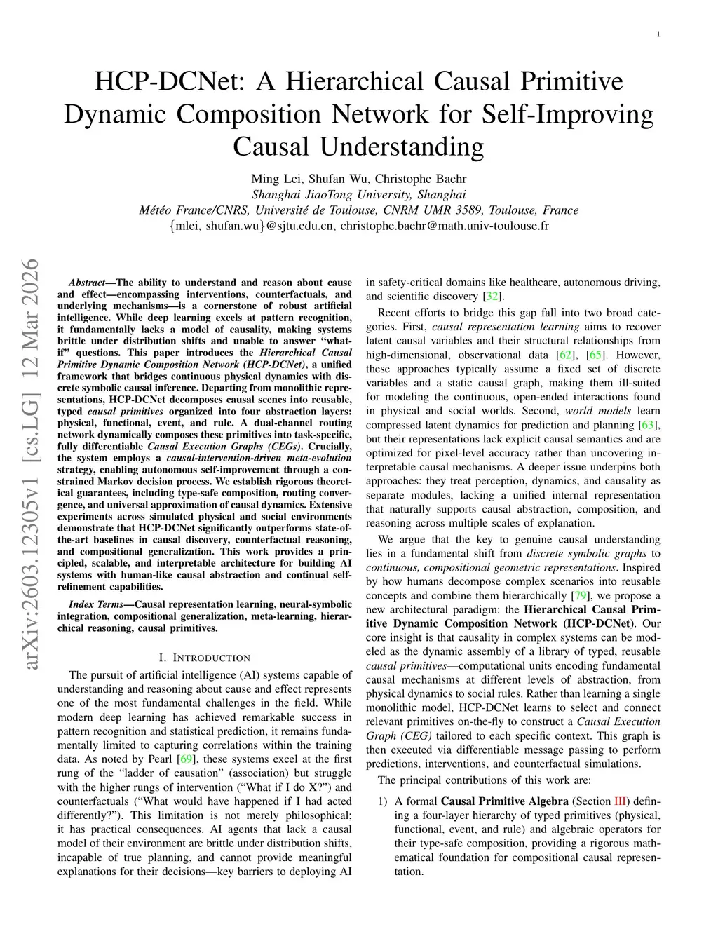 The ability to understand and reason about cause and effect -- encompassing interventions, counterfactuals, and underlying mechanisms -- is a cornerstone of robust artificial intelligence. While deep learning excels at pattern recognition, it fundamentally lacks a model of causality, making systems brittle under distribution shifts and unable to answer ``what-if'' questions. This paper introduces the \emph{Hierarchical Causal Primitive Dynamic Composition Network (HCP-DCNet)}, a unified framework that bridges continuous physical dynamics with discrete symbolic causal inference. Departing from monolithic representations, HCP-DCNet decomposes causal scenes into reusable, typed \emph{causal primitives} organized into four abstraction layers: physical, functional, event, and rule. A dual-channel routing network dynamically composes these primitives into task-specific, fully differentiable \emph{Causal Execution Graphs (CEGs)}. Crucially, the system employs a \emph{causal-intervention-driven meta-evolution} strategy, enabling autonomous self-improvement through a constrained Markov decision process. We establish rigorous theoretical guarantees, including type-safe composition, routing convergence, and universal approximation of causal dynamics. Extensive experiments across simulated physical and social environments demonstrate that HCP-DCNet significantly outperforms state-of-the-art baselines in causal discovery, counterfactual reasoning, and compositional generalization. This work provides a principled, scalable, and interpretable architecture for building AI systems with human-like causal abstraction and continual self-refinement capabilities.