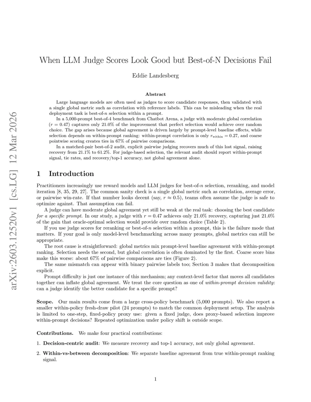 Large language models are often used as judges to score candidate responses, then validated with a single global metric such as correlation with reference labels. This can be misleading when the real deployment task is best-of-n selection within a prompt.In a 5,000-prompt best-of-4 benchmark from Chatbot Arena, a judge with moderate global correlation (r = 0.47) captures only 21.0% of the improvement that perfect selection would achieve over random choice. The gap arises because global agreement is driven largely by prompt-level baseline effects, while selection depends on within-prompt ranking: within-prompt correlation is only r_within = 0.27, and coarse pointwise scoring creates ties in 67% of pairwise comparisons.In a matched-pair best-of-2 audit, explicit pairwise judging recovers much of this lost signal, raising recovery from 21.1% to 61.2%. For judge-based selection, the relevant audit should report within-prompt signal, tie rates, and recovery/top-1 accuracy, not global agreement alone.