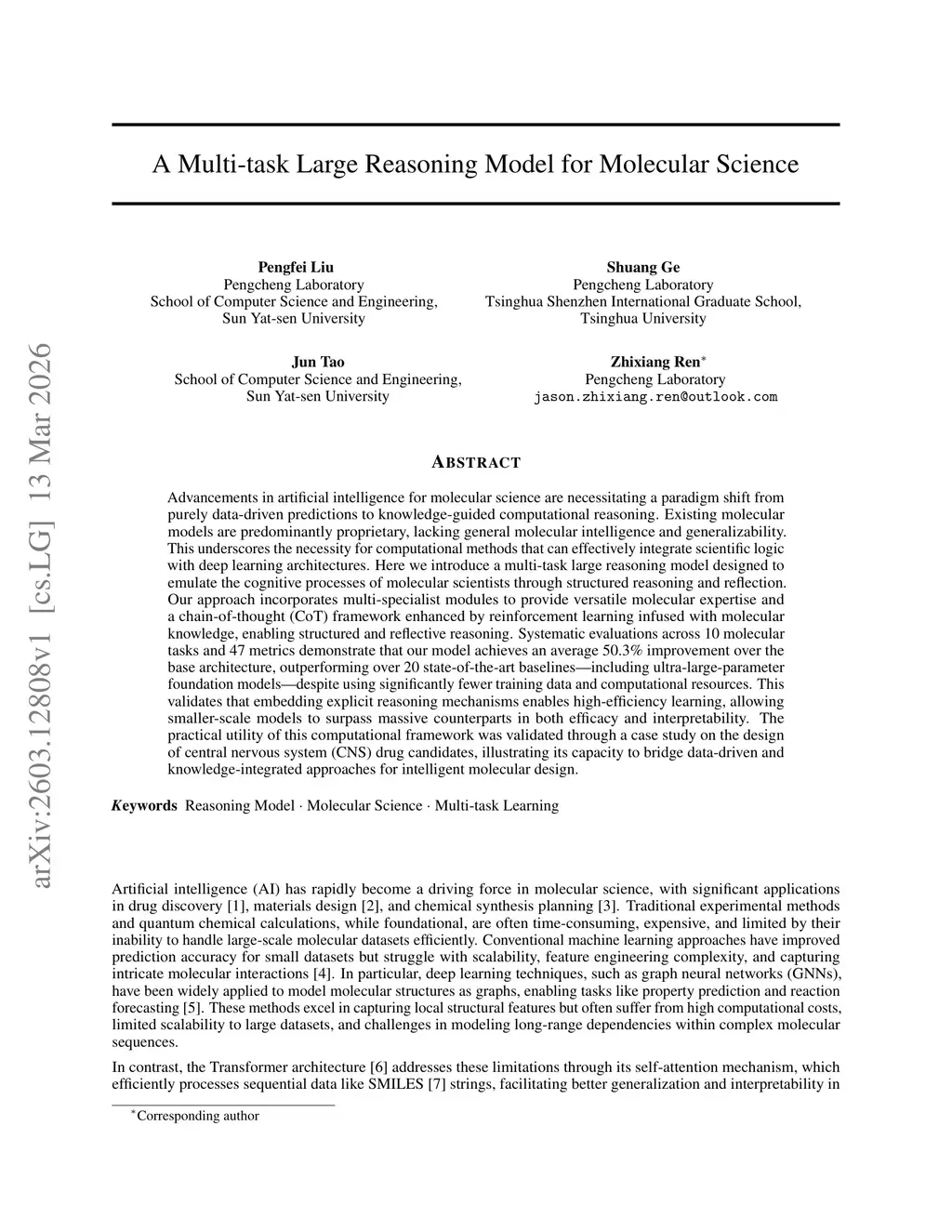 Advancements in artificial intelligence for molecular science are necessitating a paradigm shift from purely data-driven predictions to knowledge-guided computational reasoning. Existing molecular models are predominantly proprietary, lacking general molecular intelligence and generalizability. This underscores the necessity for computational methods that can effectively integrate scientific logic with deep learning architectures. Here we introduce a multi-task large reasoning model designed to emulate the cognitive processes of molecular scientists through structured reasoning and reflection. Our approach incorporates multi-specialist modules to provide versatile molecular expertise and a chain-of-thought (CoT) framework enhanced by reinforcement learning infused with molecular knowledge, enabling structured and reflective reasoning. Systematic evaluations across 10 molecular tasks and 47 metrics demonstrate that our model achieves an average 50.3% improvement over the base architecture, outperforming over 20 state-of-the-art baselines, including ultra-large-parameter foundation models, despite using significantly fewer training data and computational resources. This validates that embedding explicit reasoning mechanisms enables high-efficiency learning, allowing smaller-scale models to surpass massive counterparts in both efficacy and interpretability. The practical utility of this computational framework was validated through a case study on the design of central nervous system (CNS) drug candidates, illustrating its capacity to bridge data-driven and knowledge-integrated approaches for intelligent molecular design.