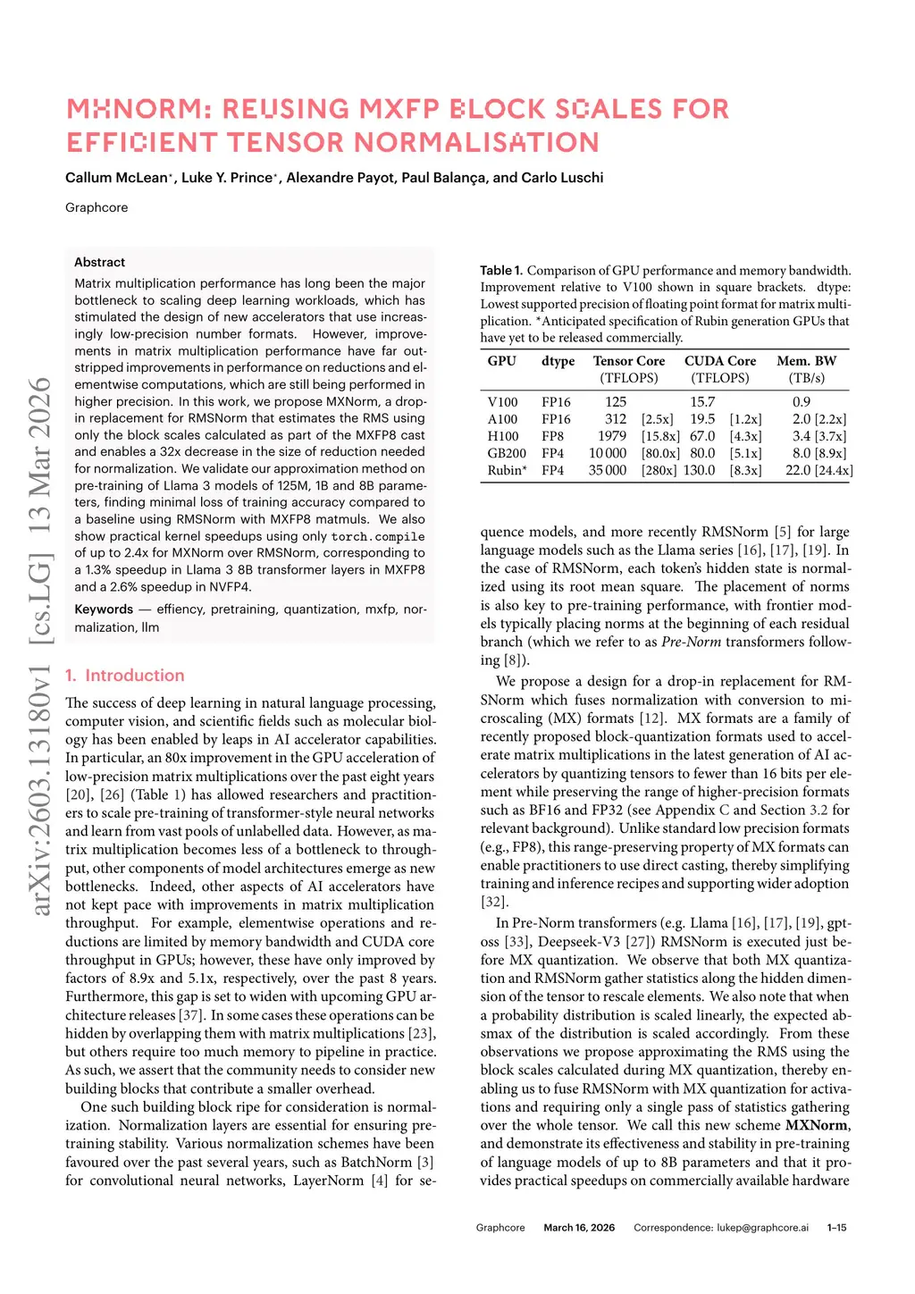 Matrix multiplication performance has long been the major bottleneck to scaling deep learning workloads, which has stimulated the design of new accelerators that use increasingly low-precision number formats. However, improvements in matrix multiplication performance have far outstripped improvements in performance on reductions and elementwise computations, which are still being performed in higher precision. In this work, we propose MXNorm, a drop-in replacement for RMSNorm that estimates the RMS using only the block scales calculated as part of the MXFP8 cast and enables a 32x decrease in the size of reduction needed for normalization. We validate our approximation method on pre-training of Llama 3 models of 125M, 1B and 8B parameters, finding minimal loss of training accuracy compared to a baseline using RMSNorm with MXFP8 matmuls. We also show practical kernel speedups using onlythis http URLof up to 2.4x for MXNorm over RMSNorm, corresponding to a 1.3% speedup in Llama 3 8B transformer layers in MXFP8 and a 2.6% speedup in NVFP4.